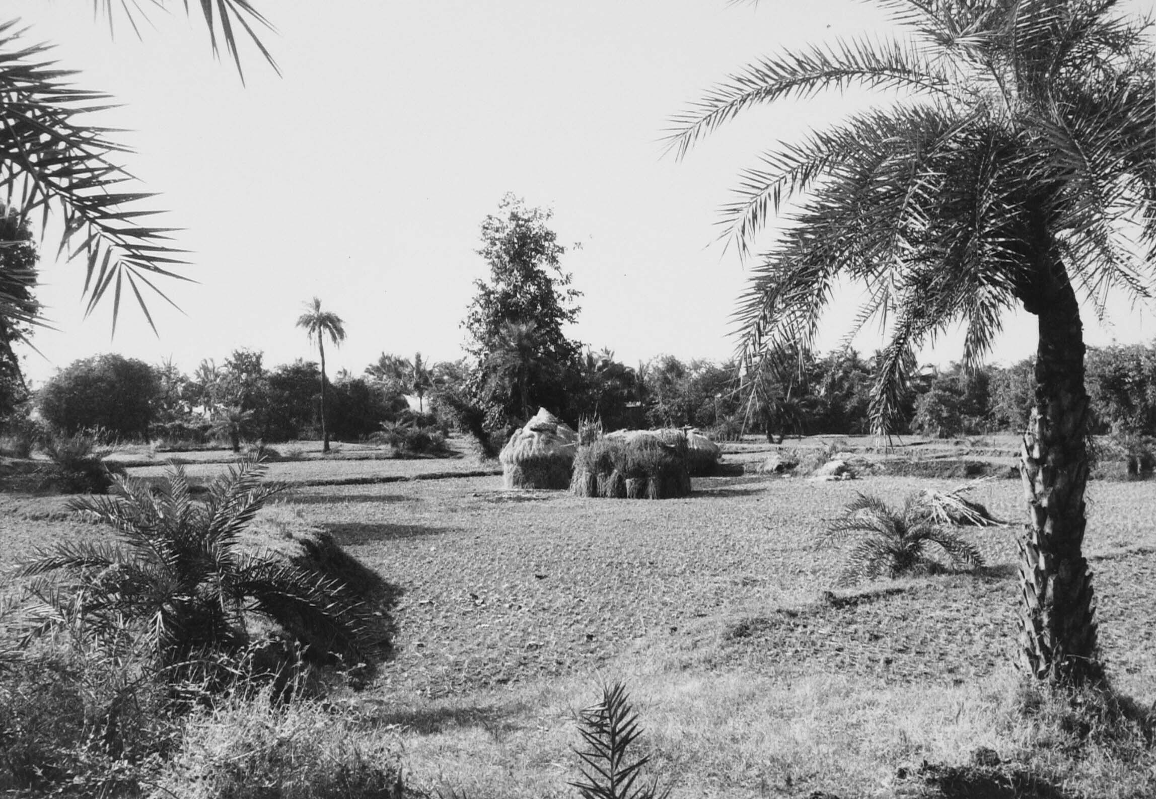 Landschap met afgeoogste rijstvelden, de palmen welk...
