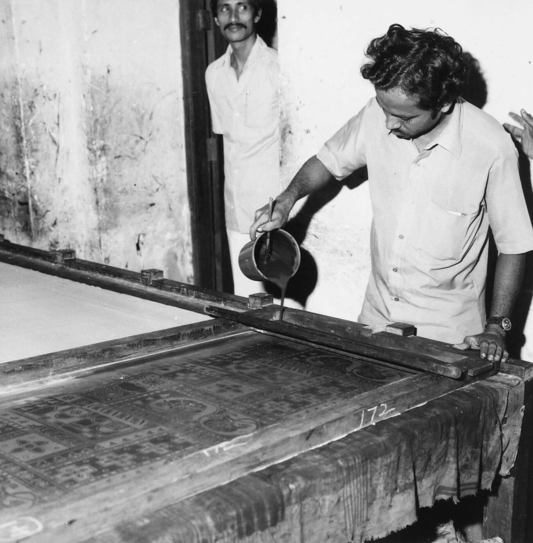 Het opgieten van verf op een de screens in het weave...