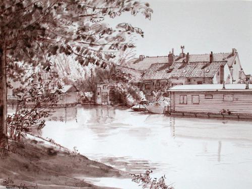 Gewassen pentekening. Woonboten aan de Vaartweg bij ...