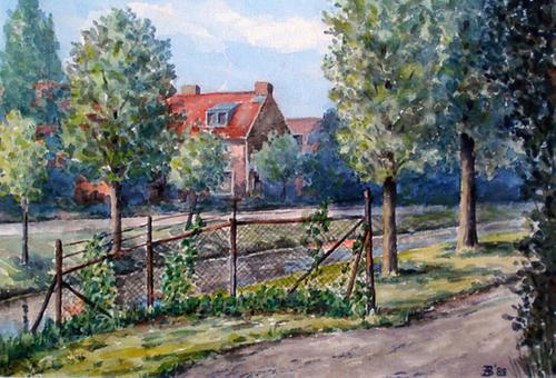Aquarel. Gezicht van af het erf Leen Droppert richti...