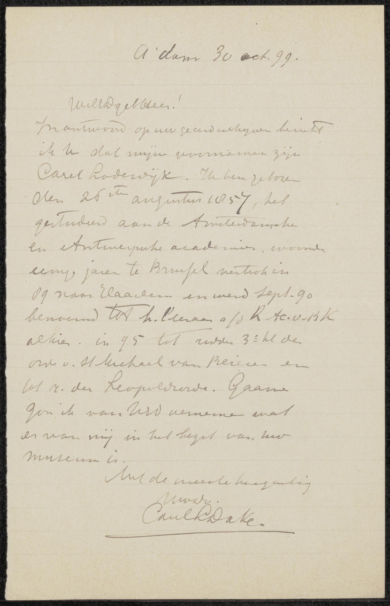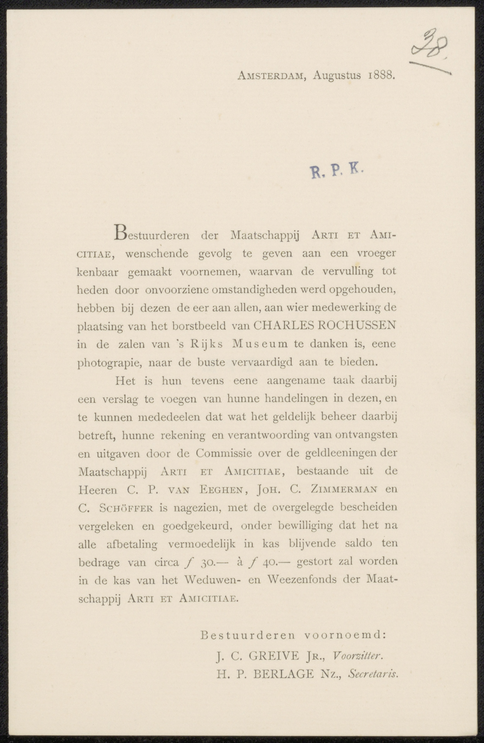 Brief betreffende het borstbeeld van Charles Rochuss...