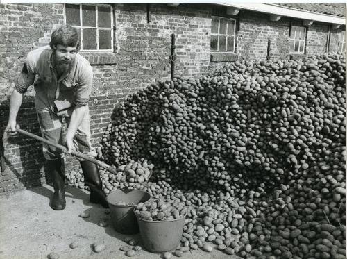 Foto in zwart-wit van een man die aardappelen schept...