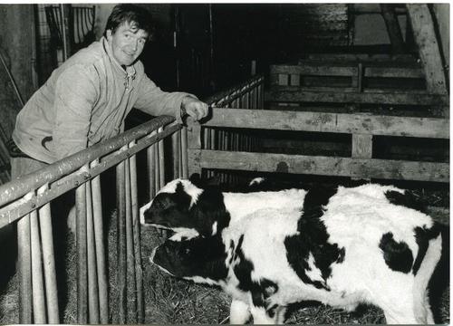 Foto in zwart-wit van een man staand bij kalveren in...