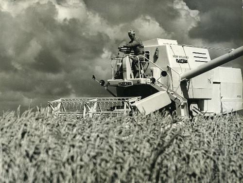 Foto in zwart-wit van een maaidorser door J.D. de Jo...