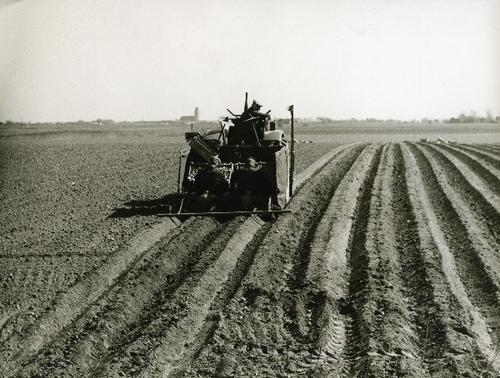 Foto in zwart-wit van het machinaal poten van aardap...