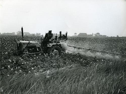 Foto in zwart-wit van het spuiten van bestrijdingsmi...