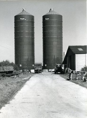Foto in zwart-wit van twee torensilo's voor kuilvoer...