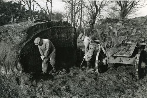 Foto in zwart-wit van het steken van kuilvoer uit ee...