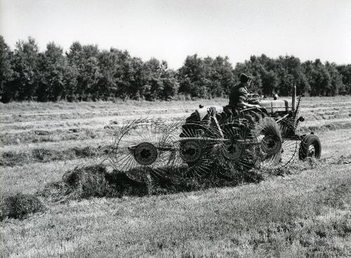Foto in zwart-wit van een tractor met harkmachine do...