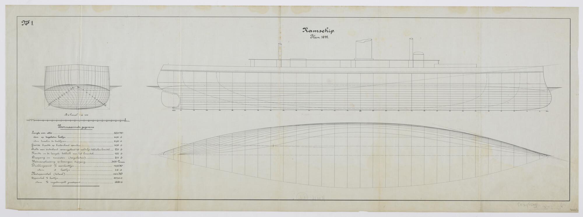 Lijnenplan met spantenraam en overzicht van de voorn...