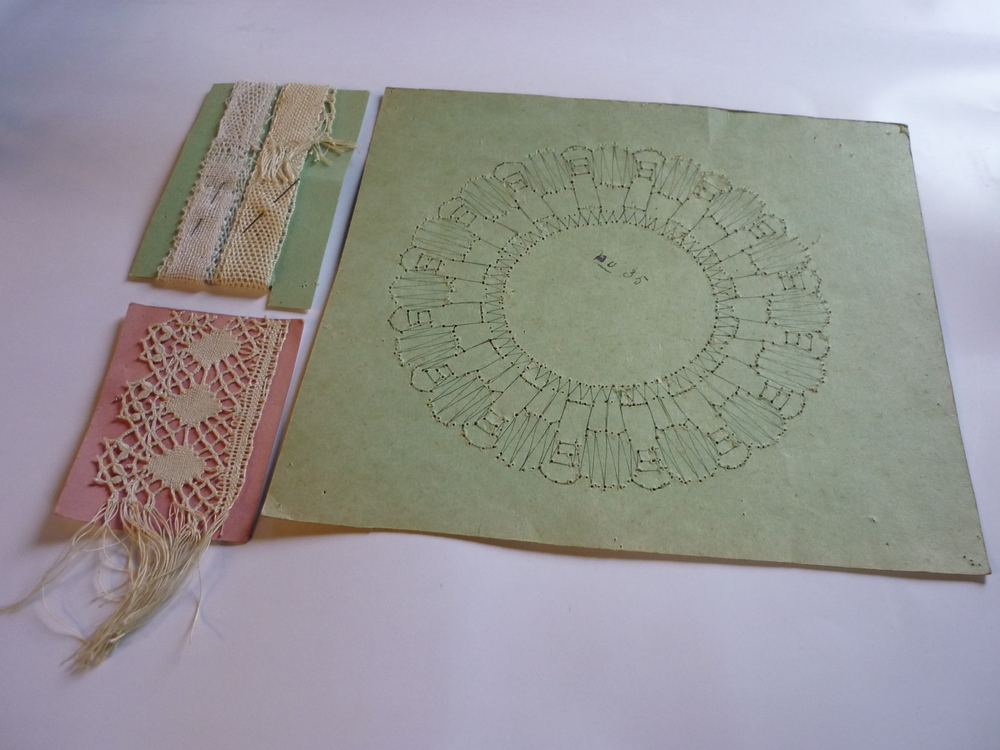 Archief doos met papieren patronen, kantklos voorbee...