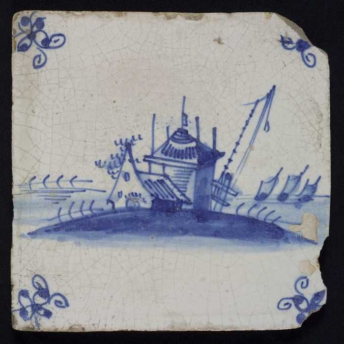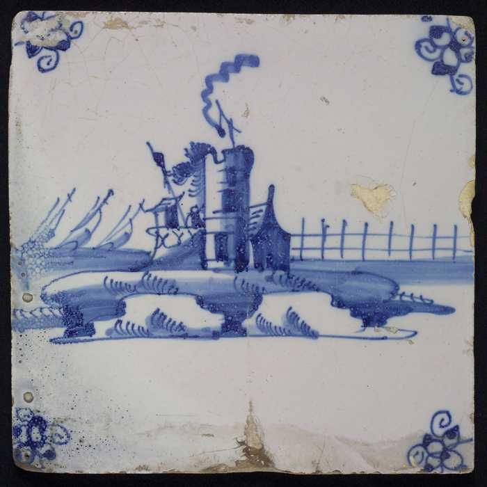 Tafereeltegel, blauw, vuurbaak en vuurtoren, hoekmot...