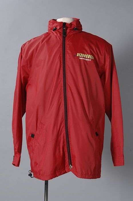 Grijs gevoerd rood jack met capuchon, opgerold in op...