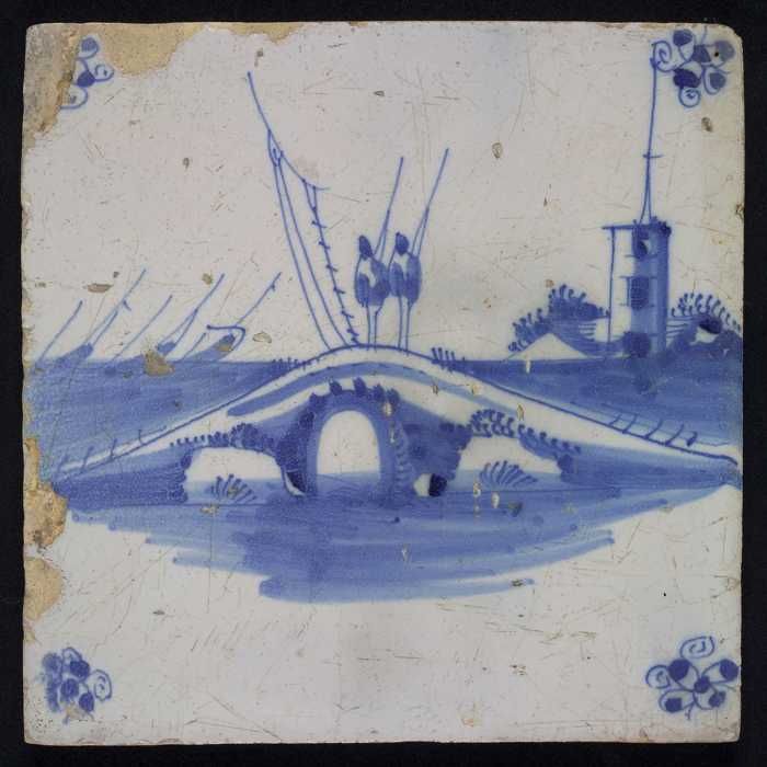 Tafereeltegel, blauw, vuurbaak en brug, hoekmotief spin