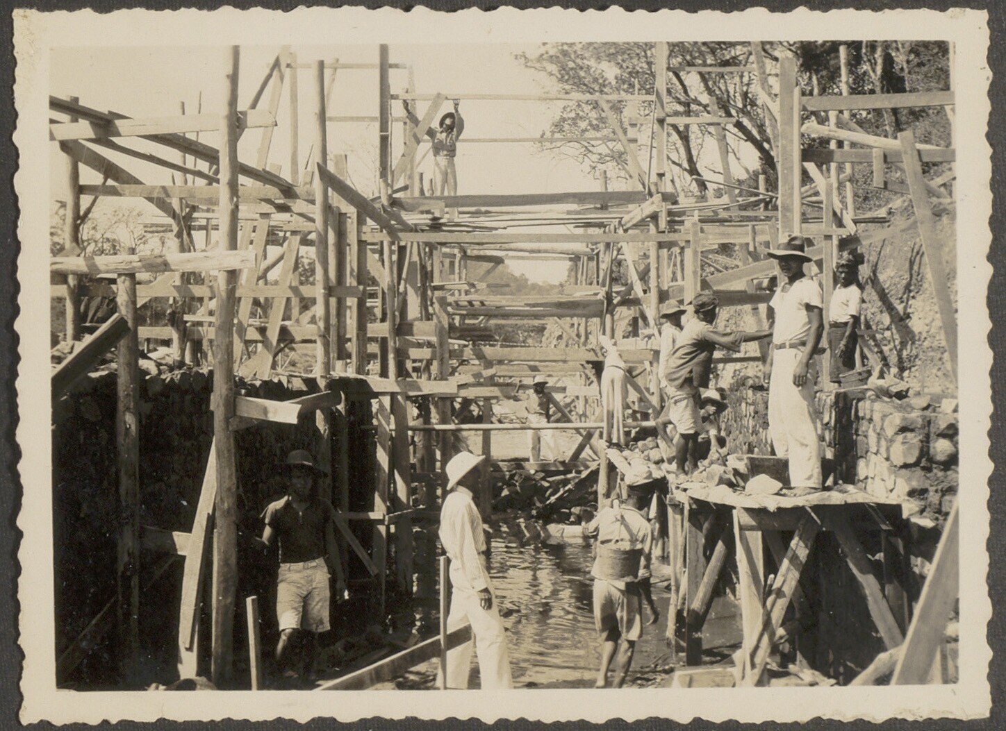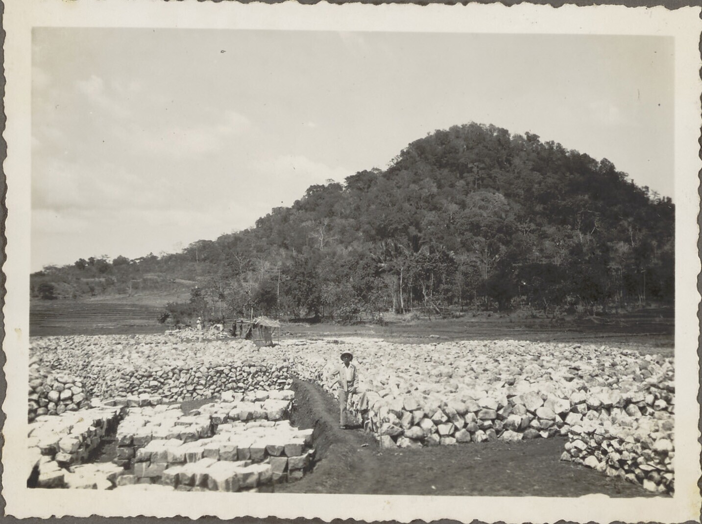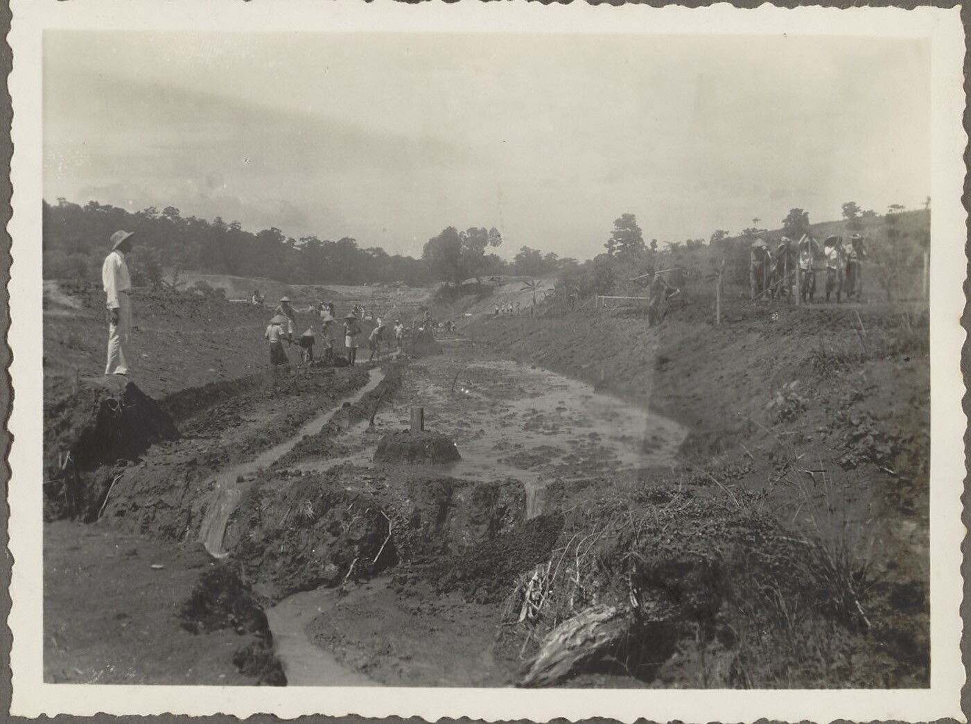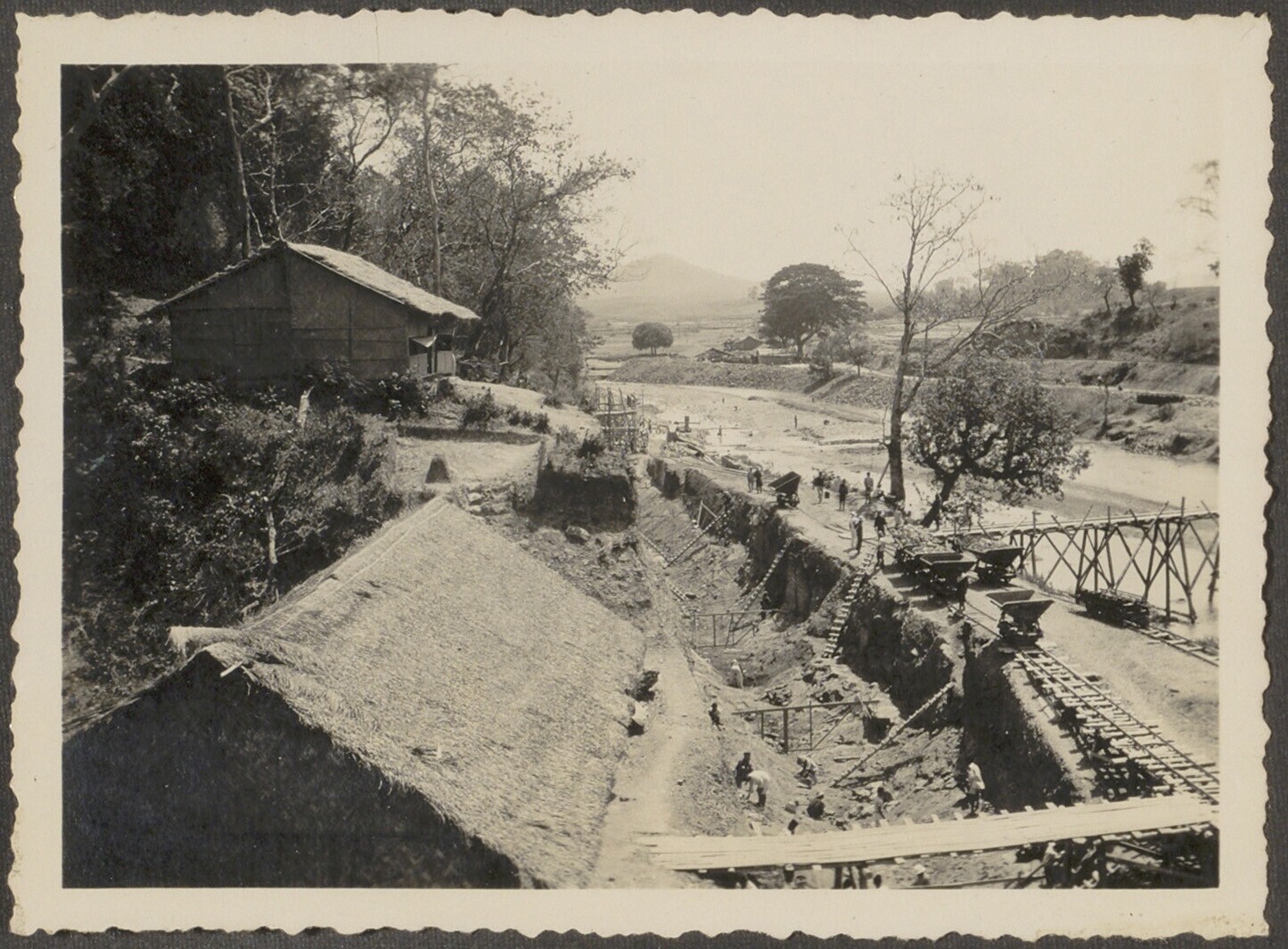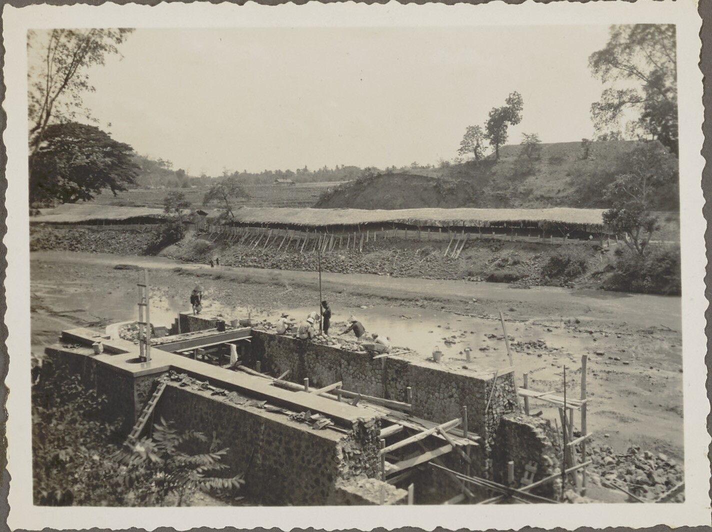 Aanleg van overlaat bij Kratjak door Javaanse arbeiders