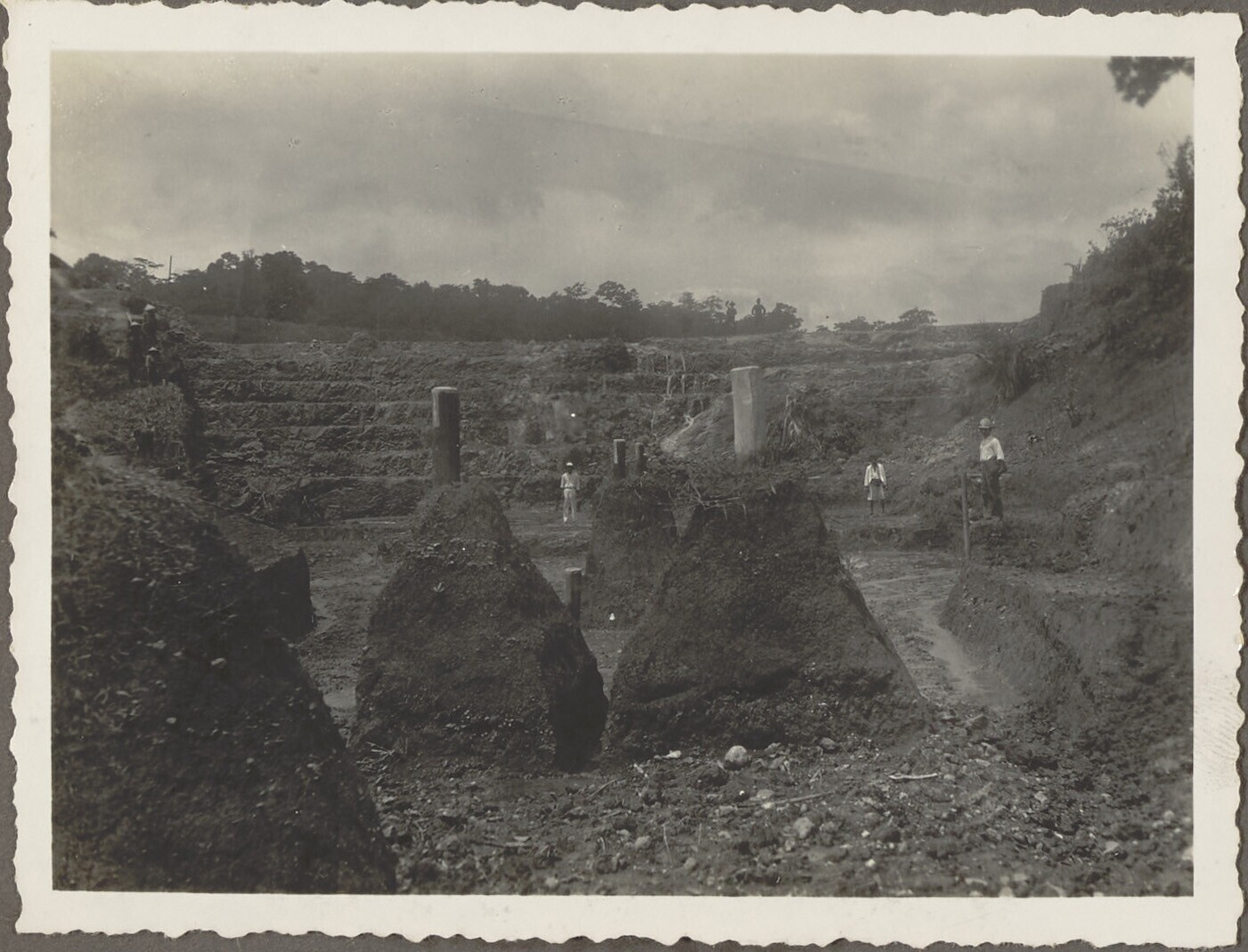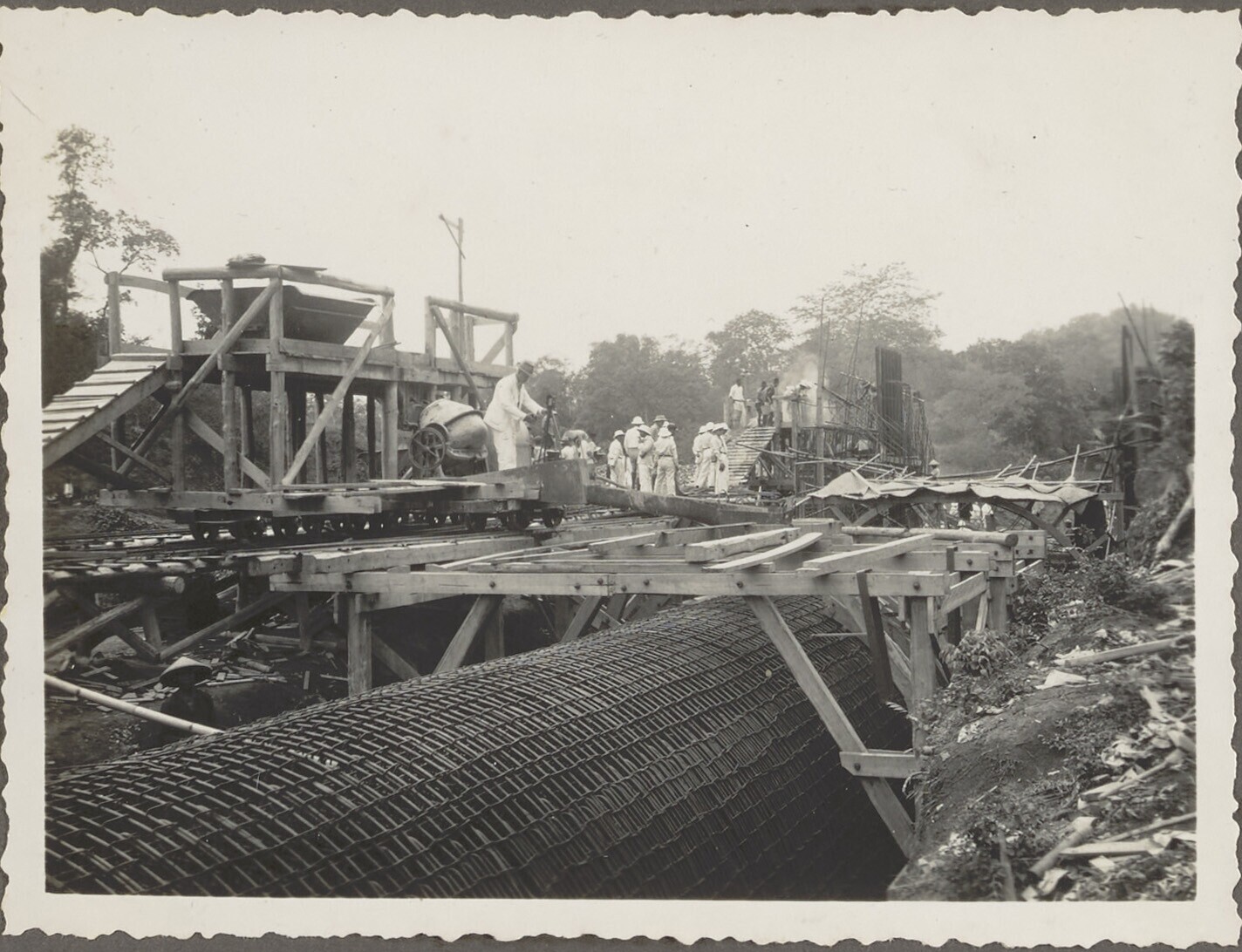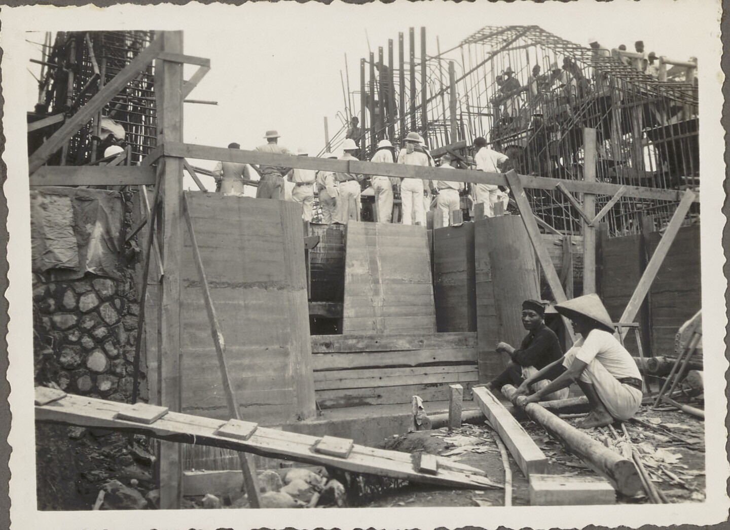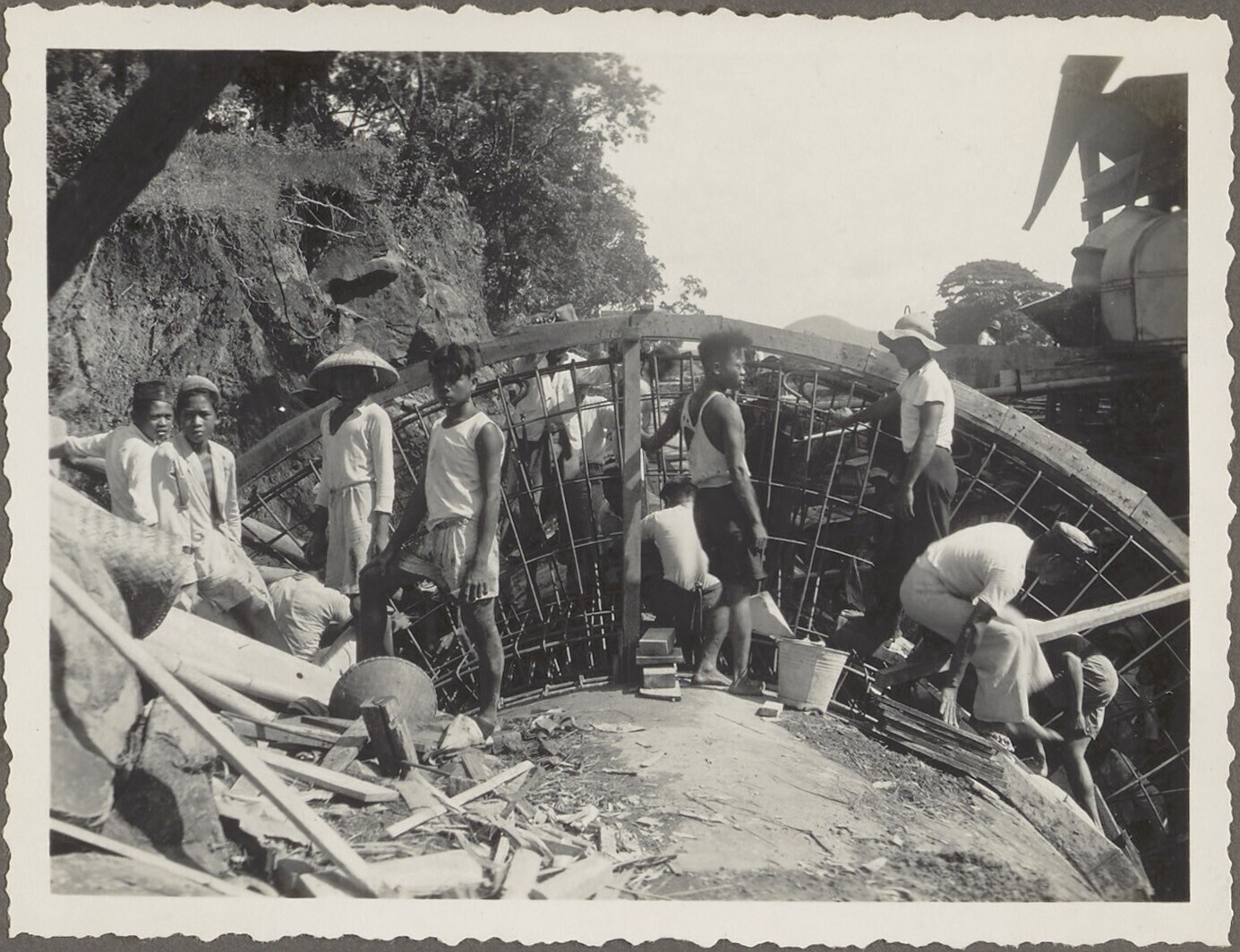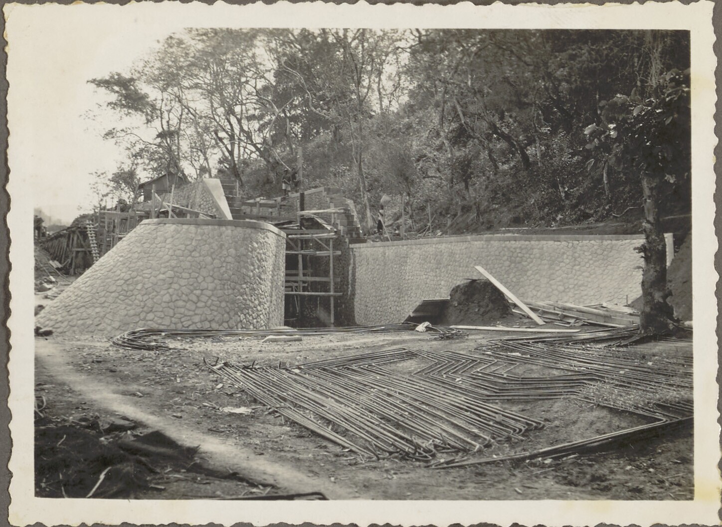 Aanleg van overlaat bij Kratjak door Javaanse arbeiders
