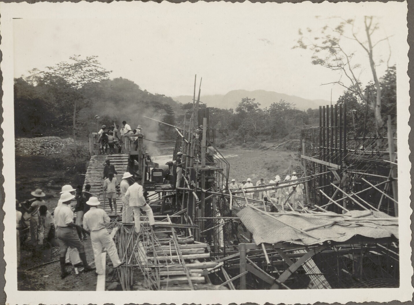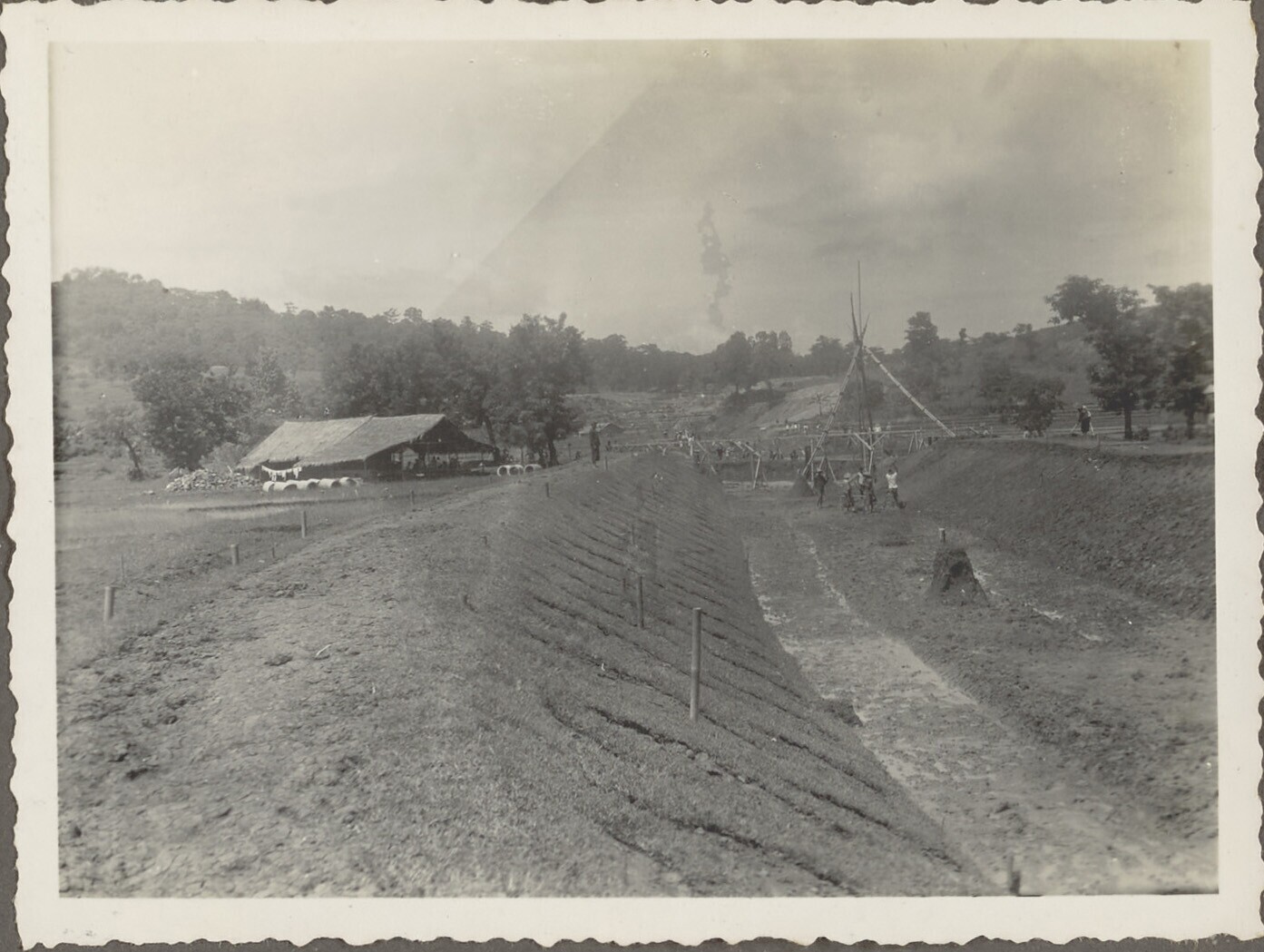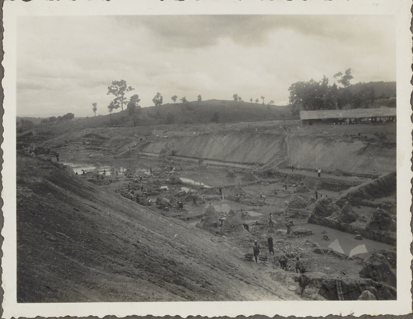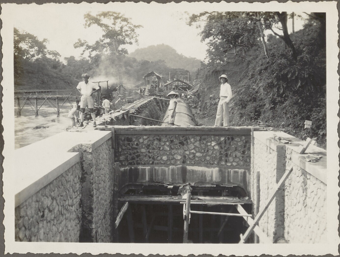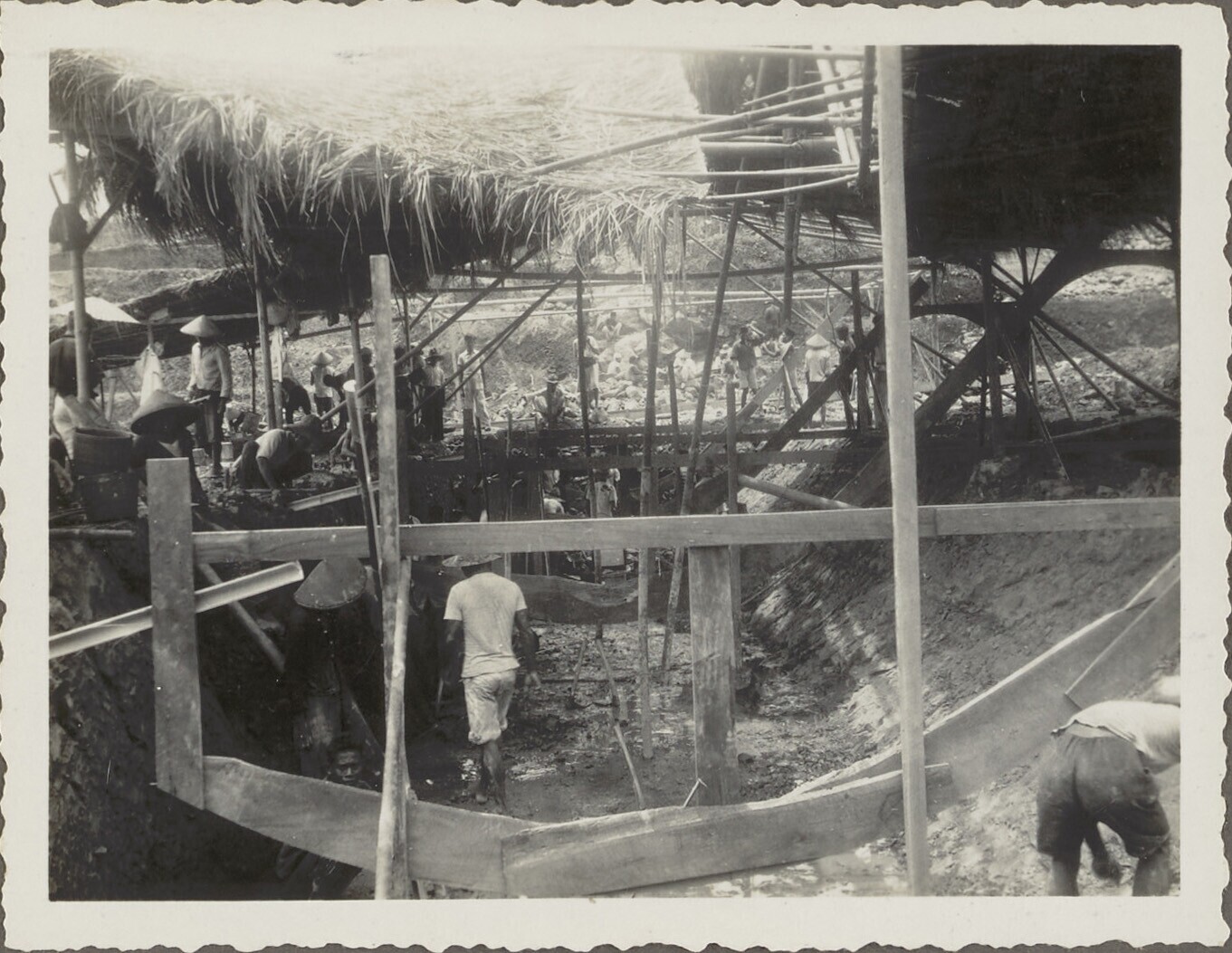 Aanleg van overlaat bij Kratjak door Javaanse arbeiders