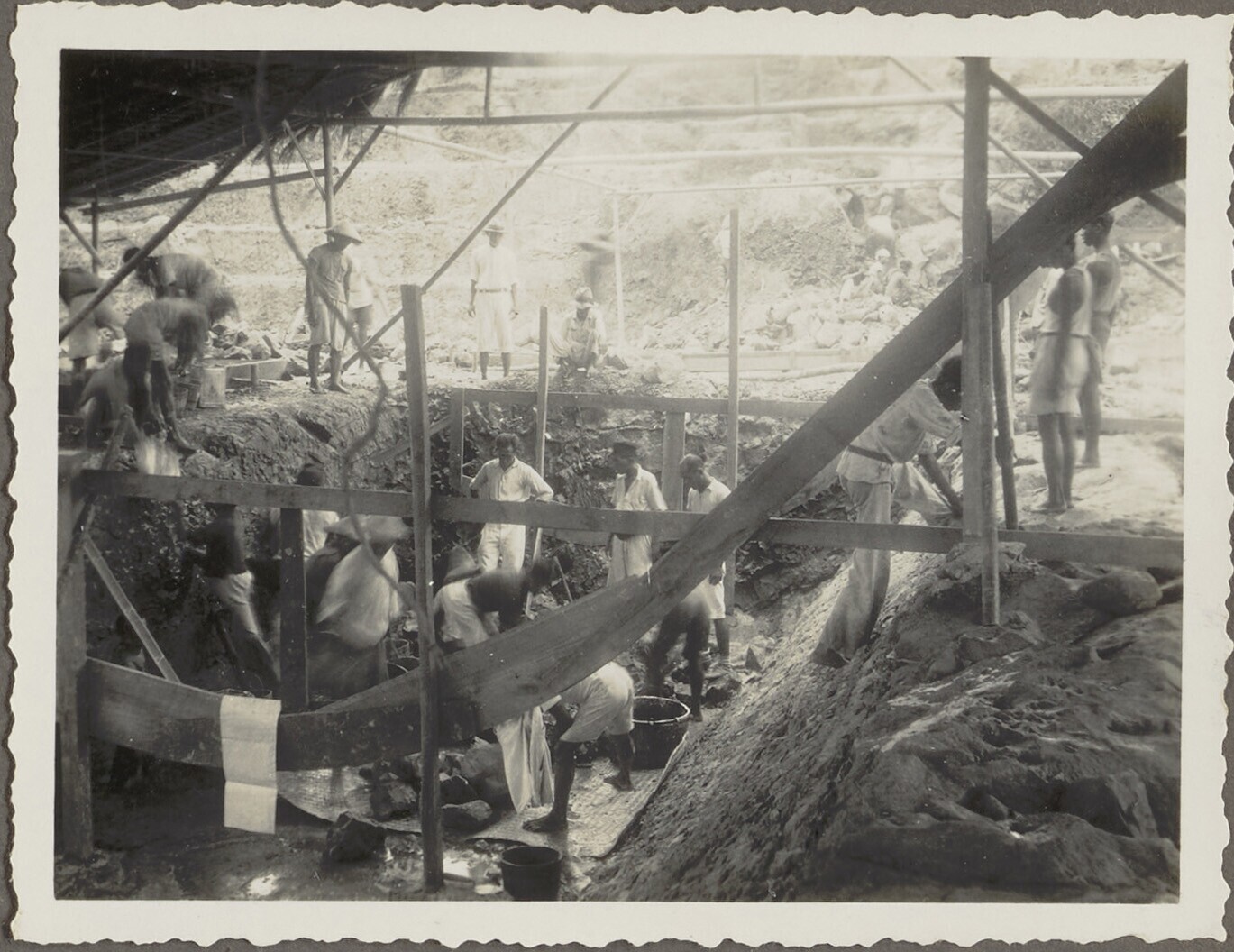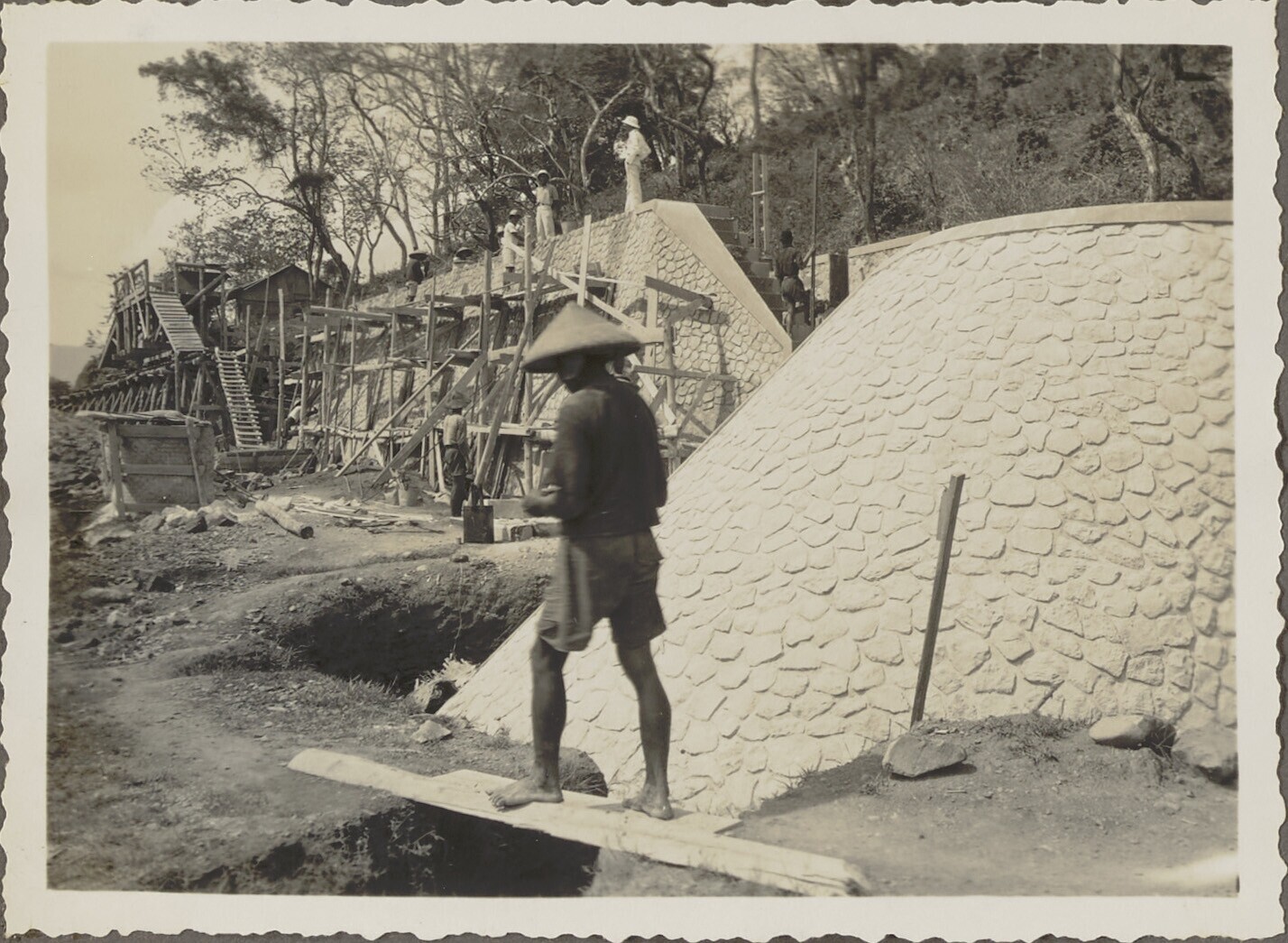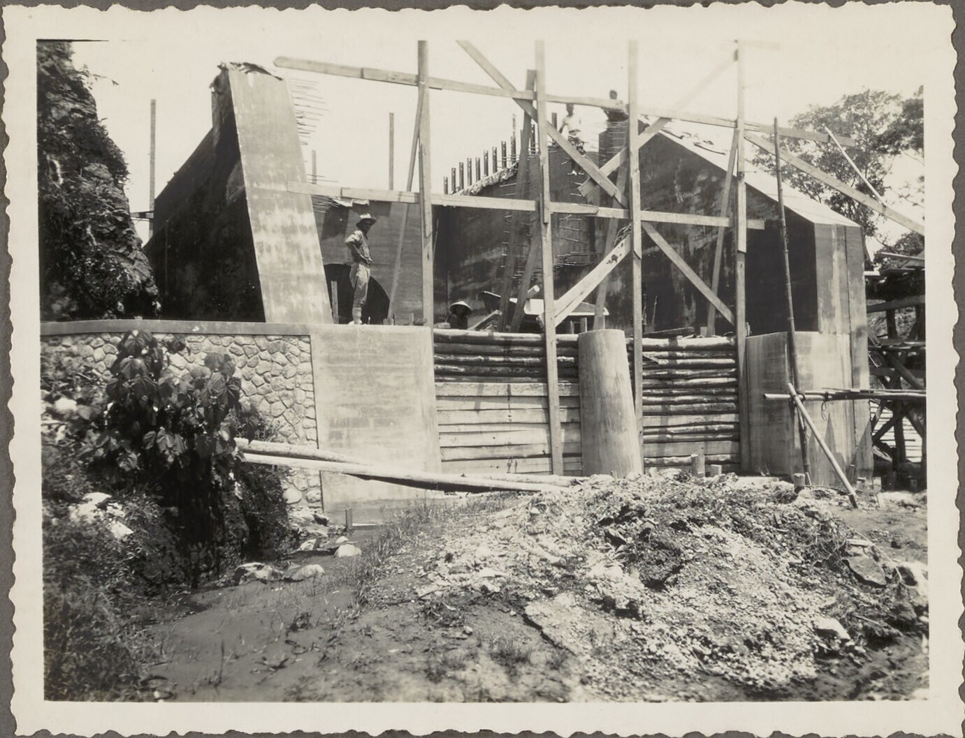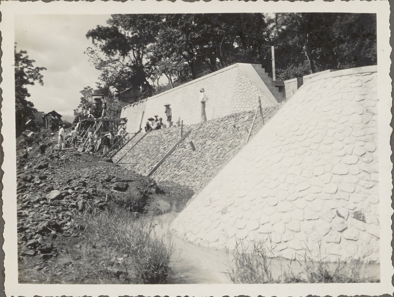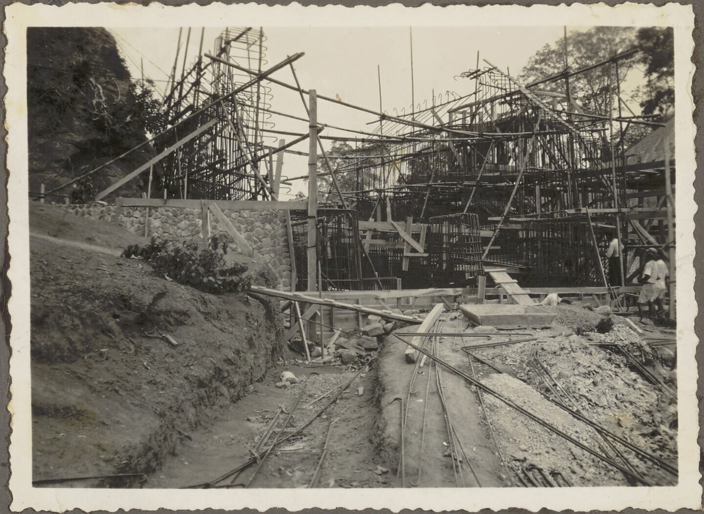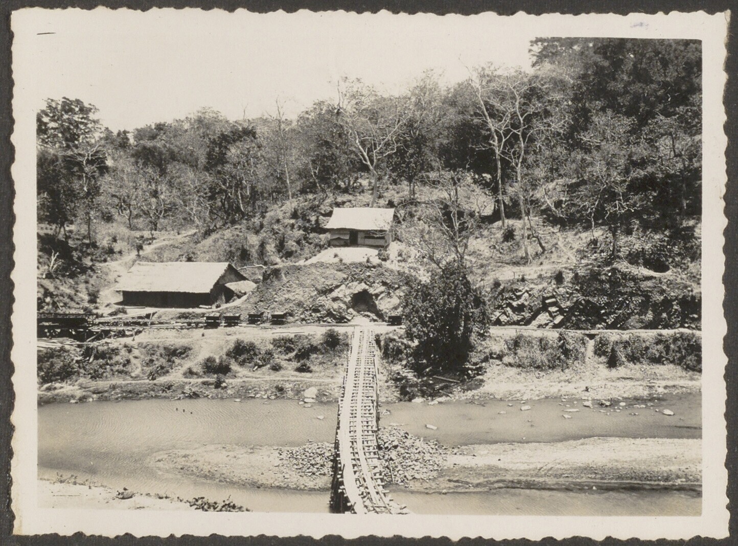 Aanleg van overlaat bij Kratjak door Javaanse arbeiders