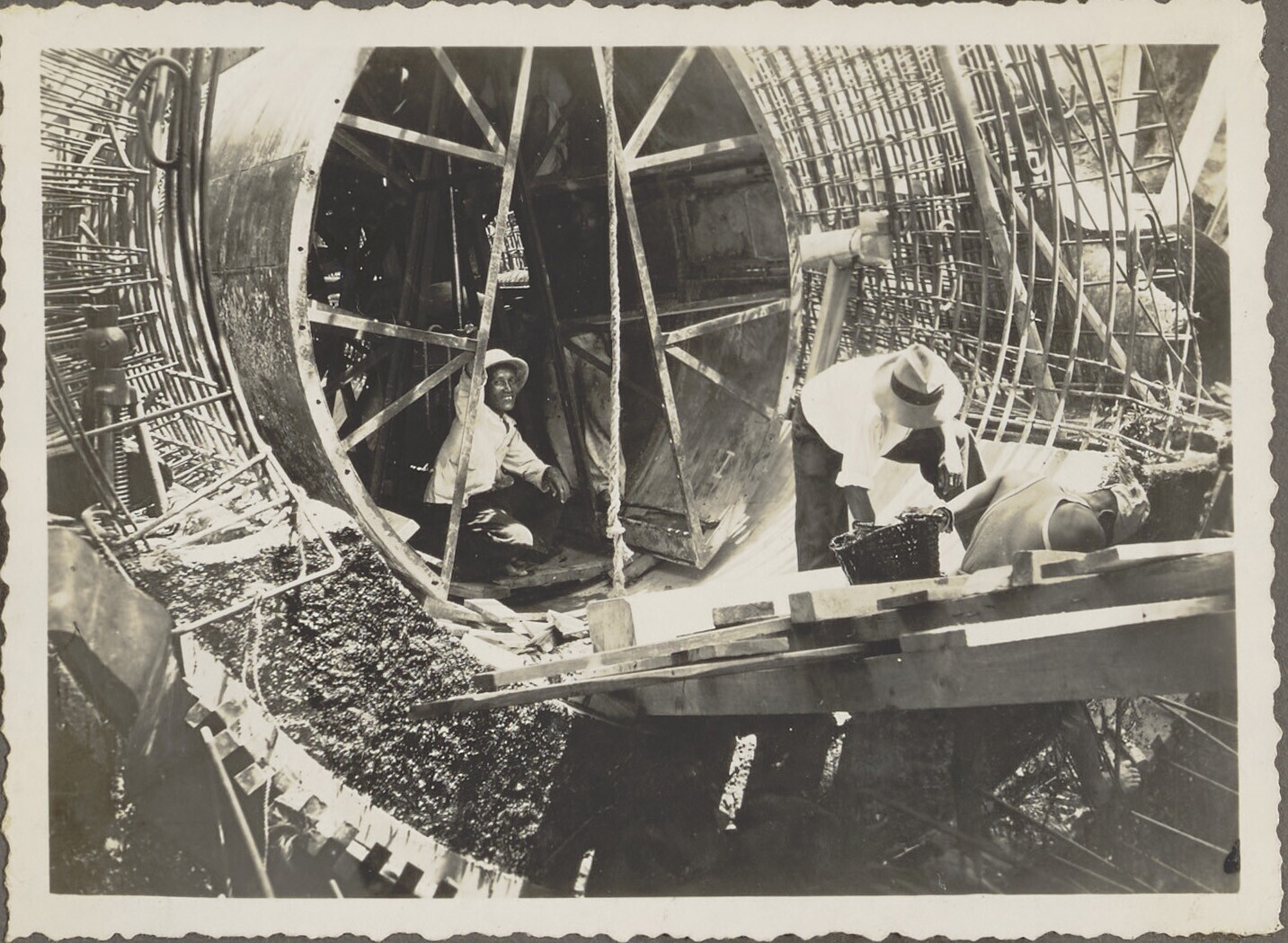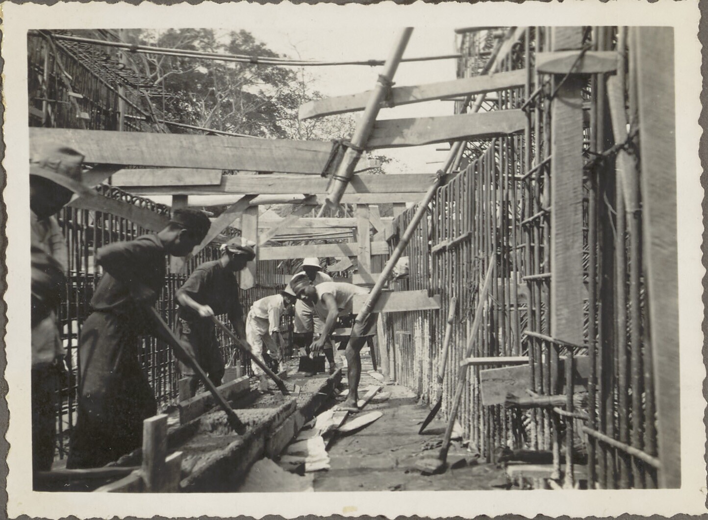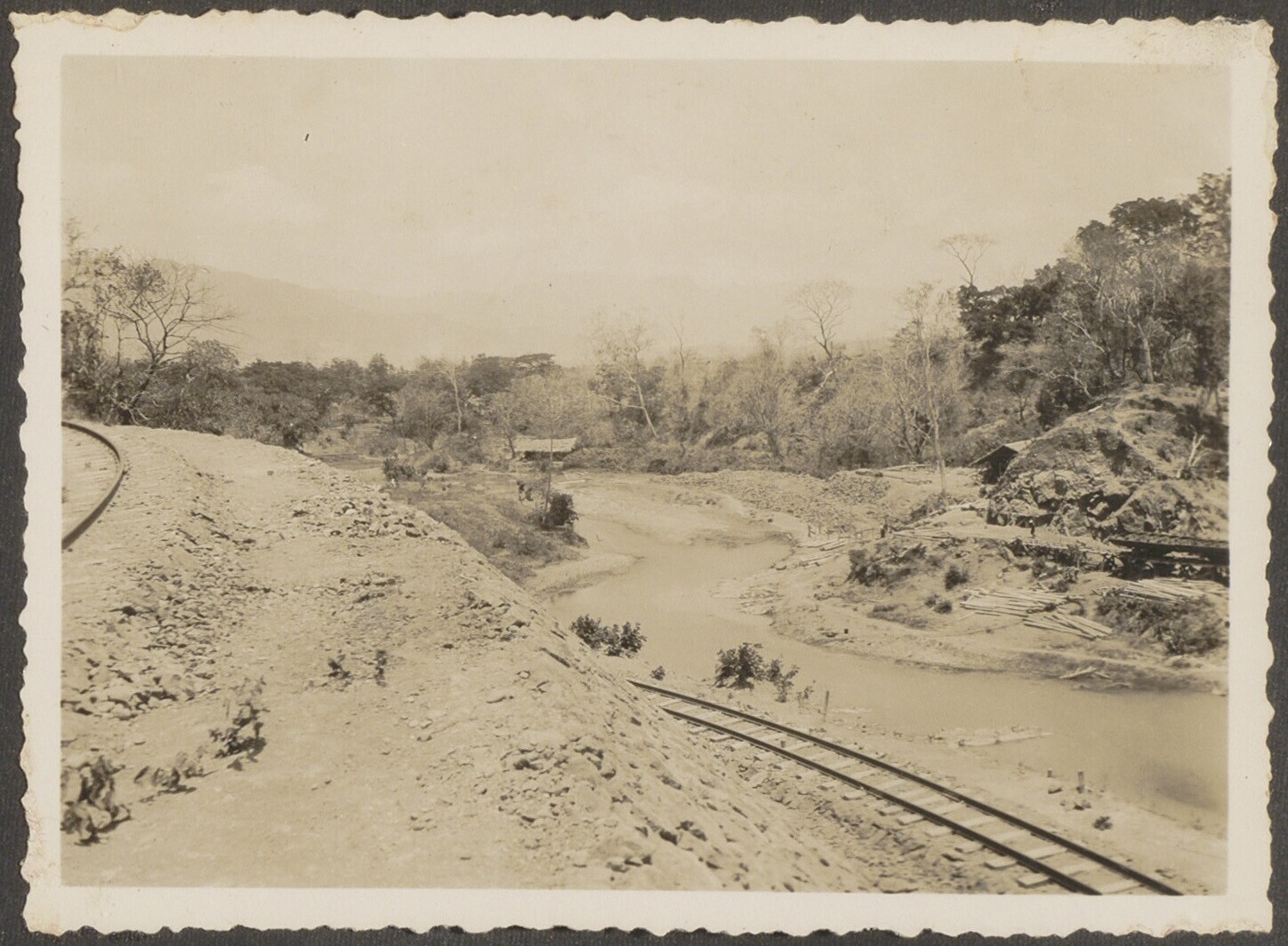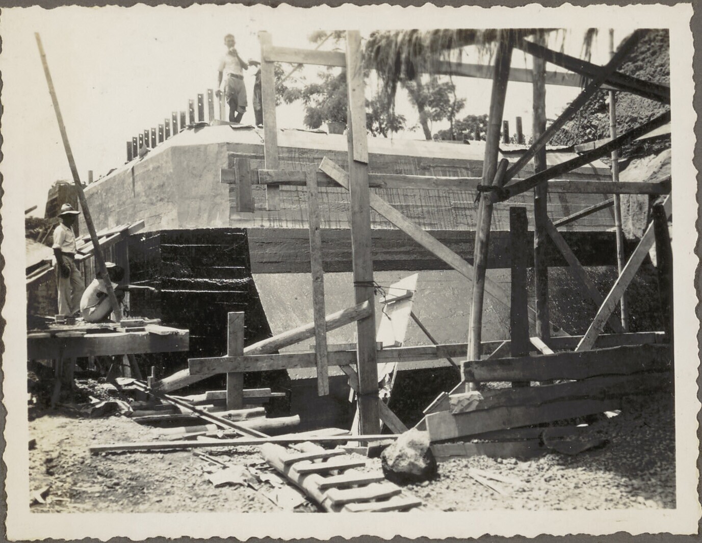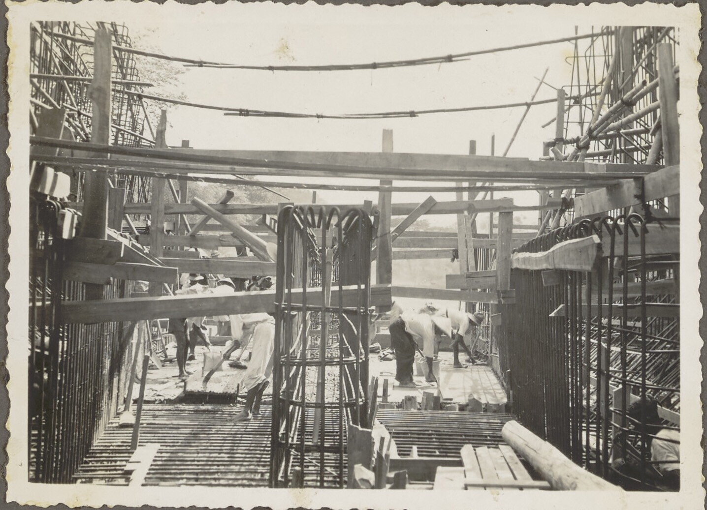 Aanleg van overlaat bij Kratjak door Javaanse arbeiders