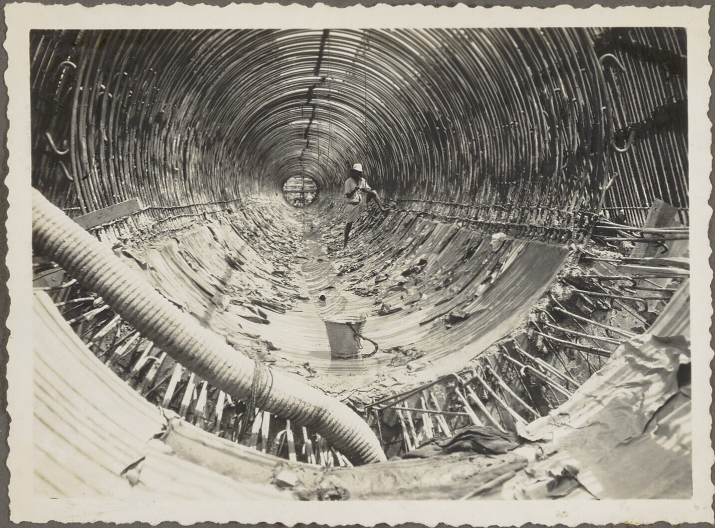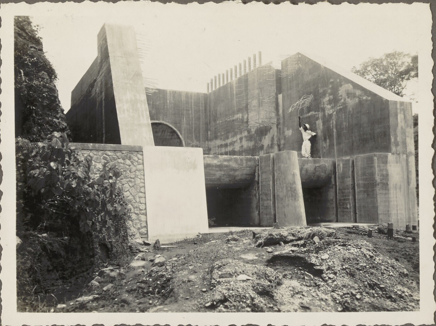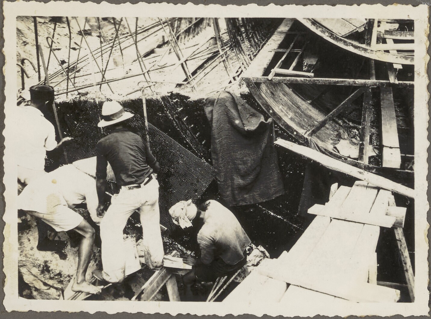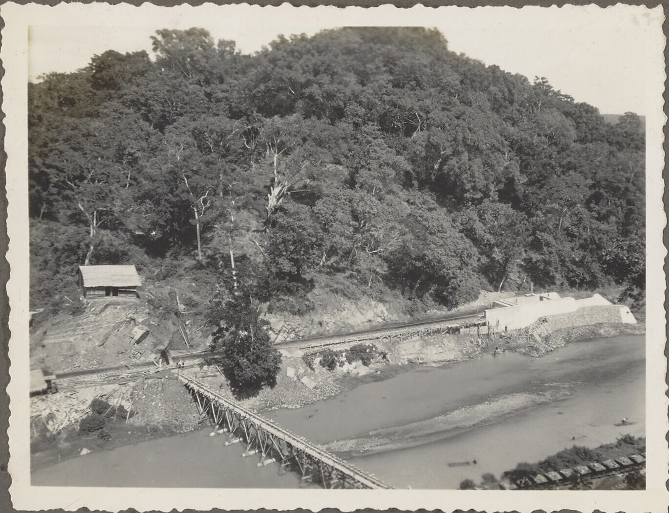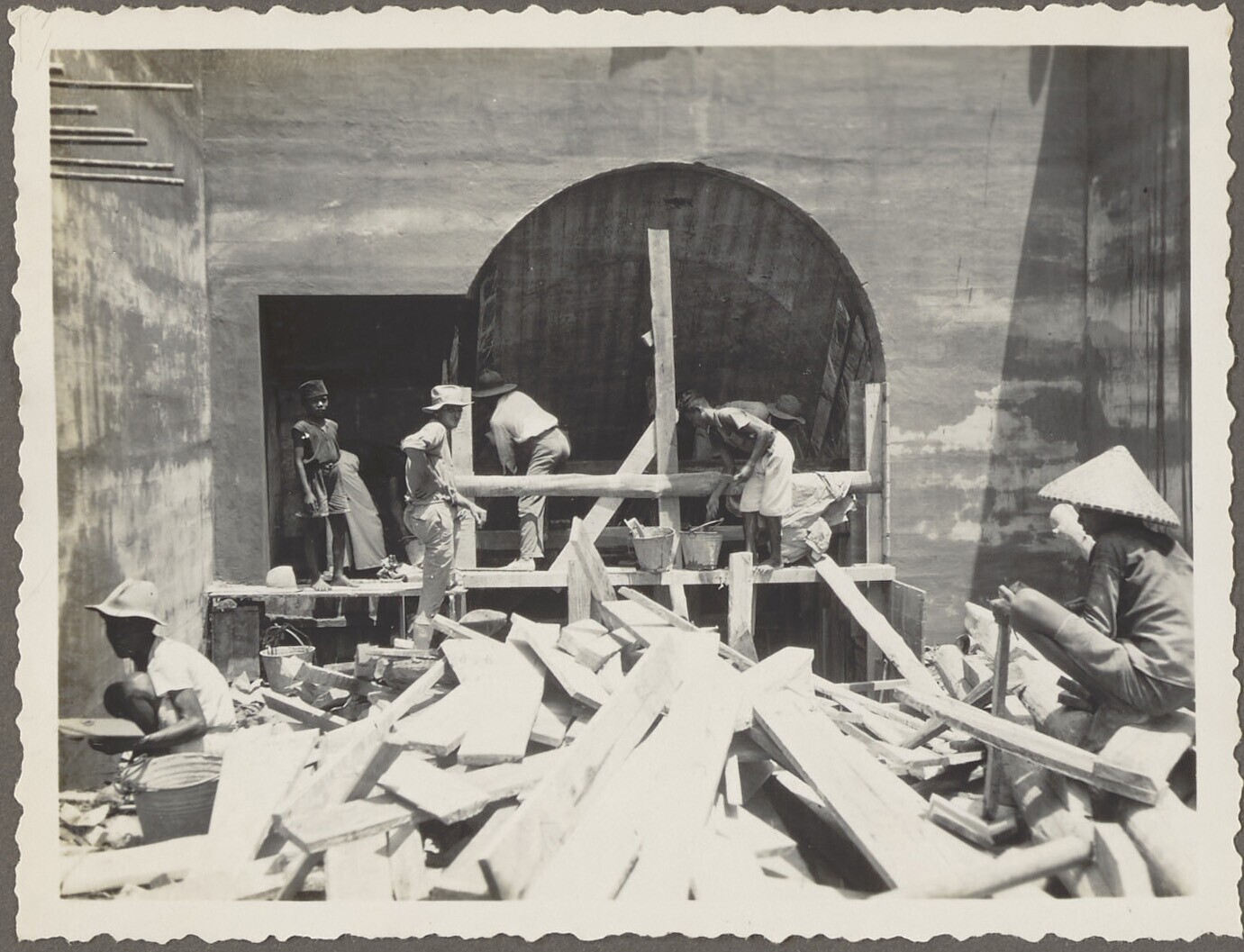 Aanleg van overlaat bij Kratjak door Javaanse arbeiders