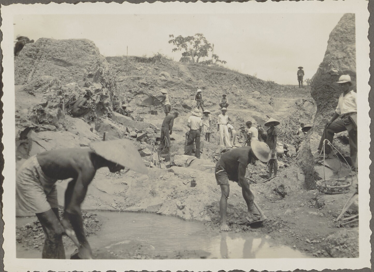 Javaanse arbeiders werken aan de aanleg van een wate...