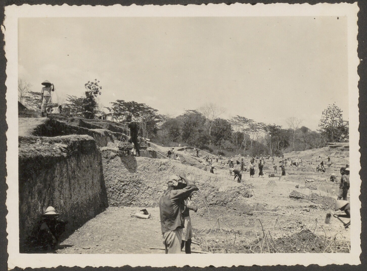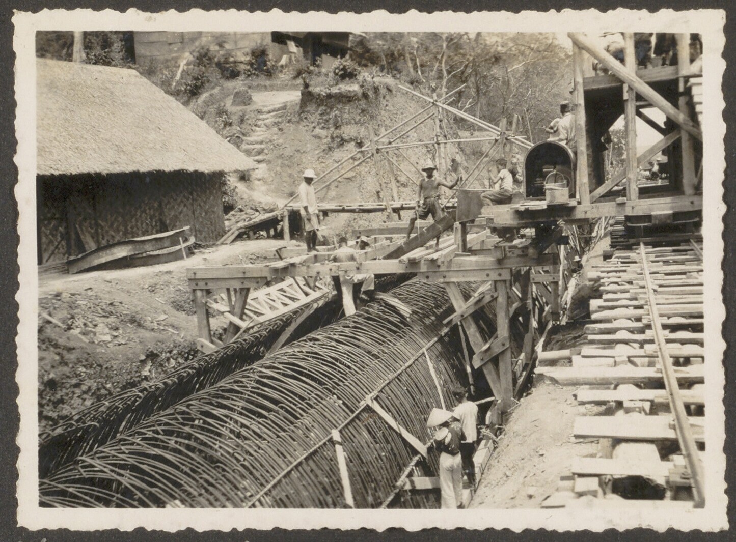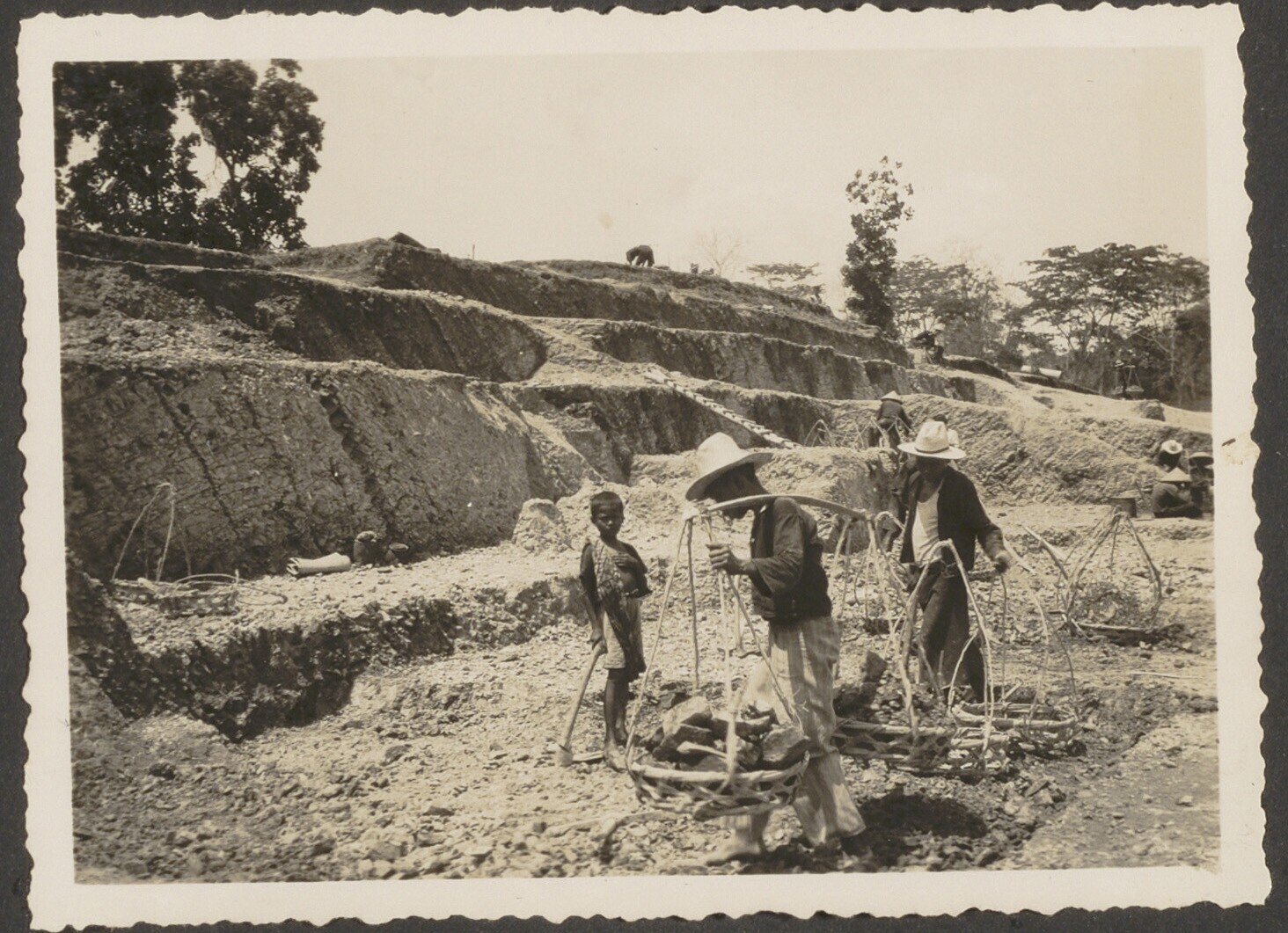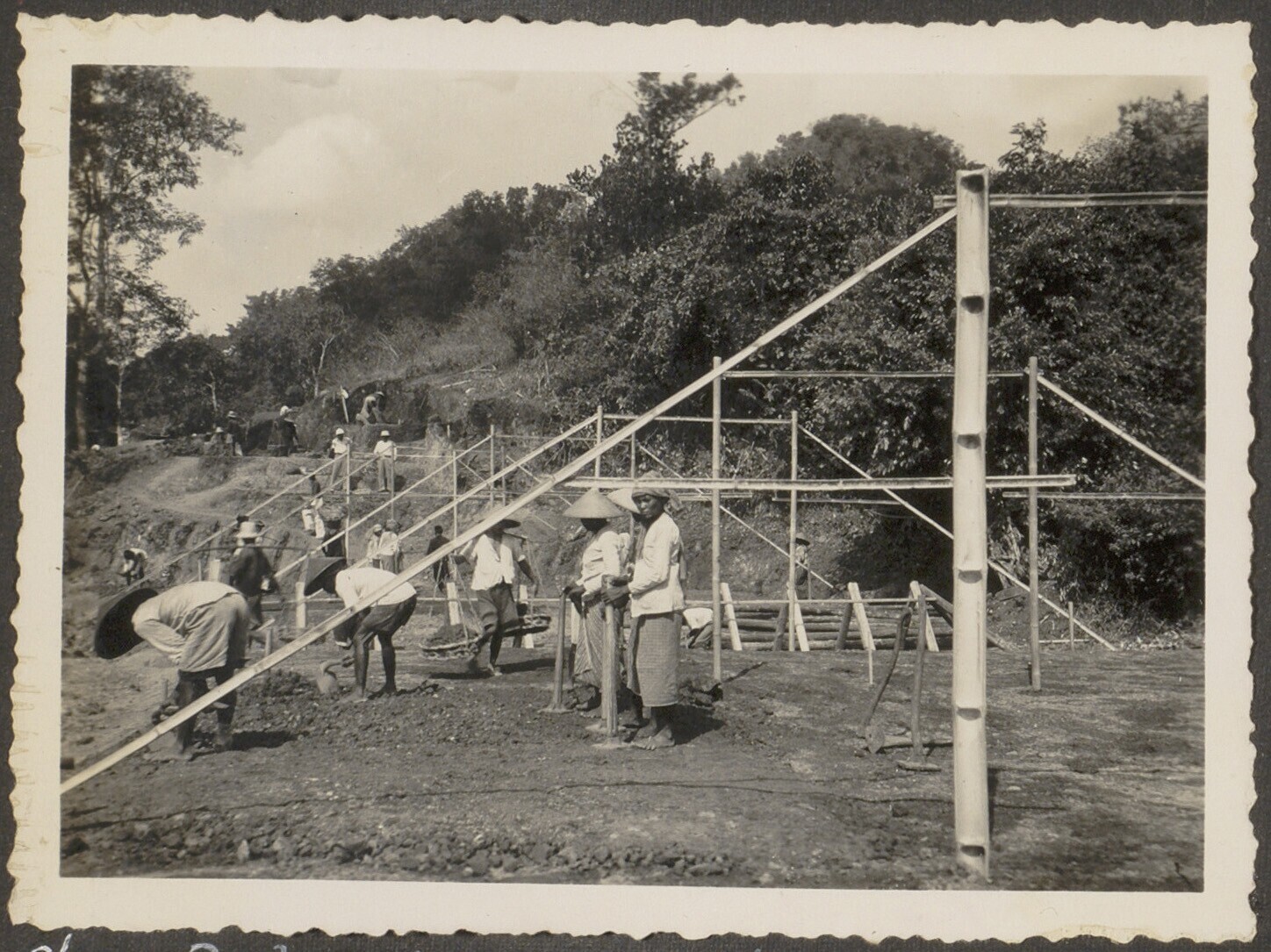 Aanleg van een spoorbaan door Javaanse arbeiders