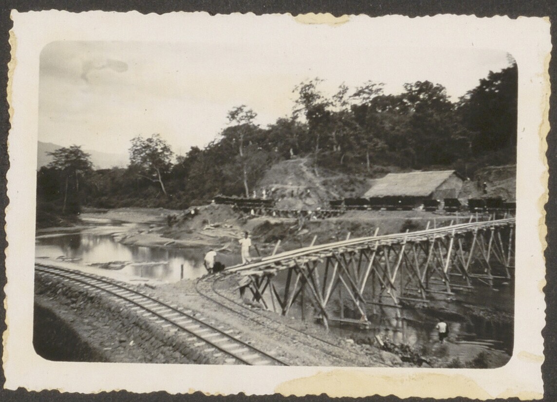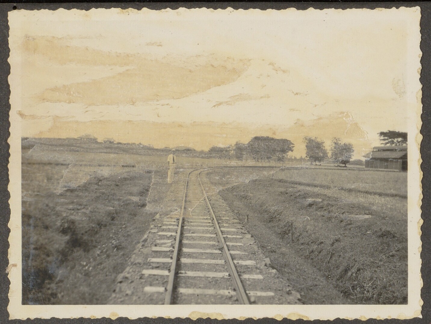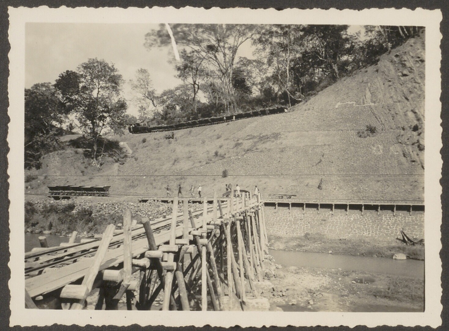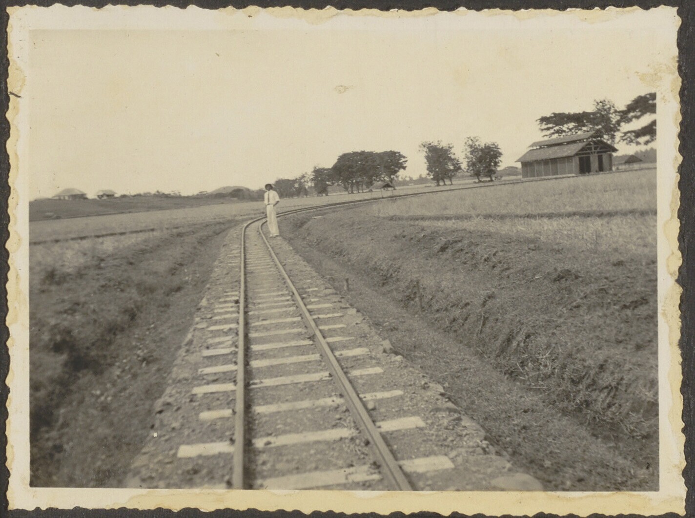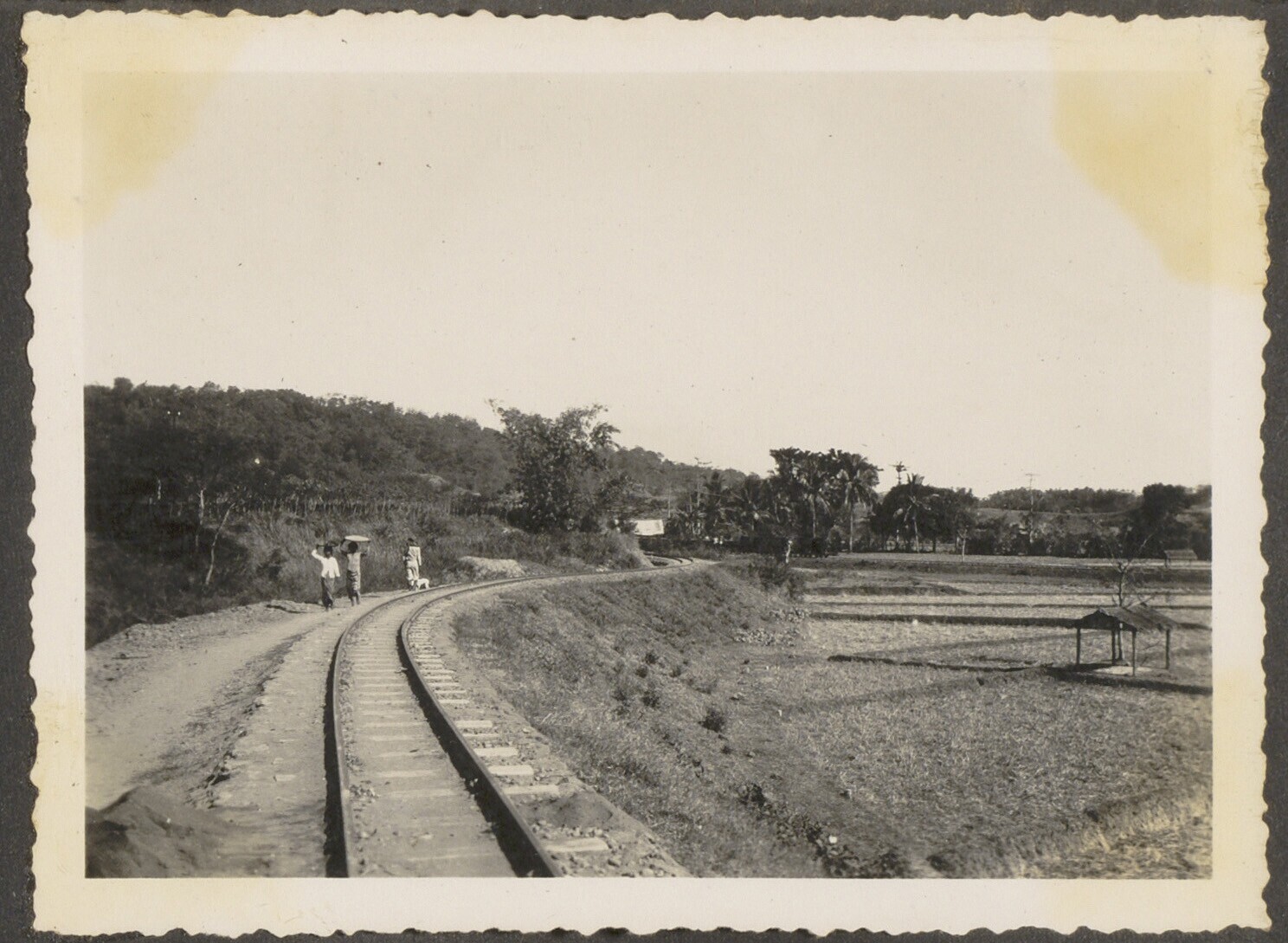 Vrouwen lopen langs een spoorweg bij de brug Malahajoe