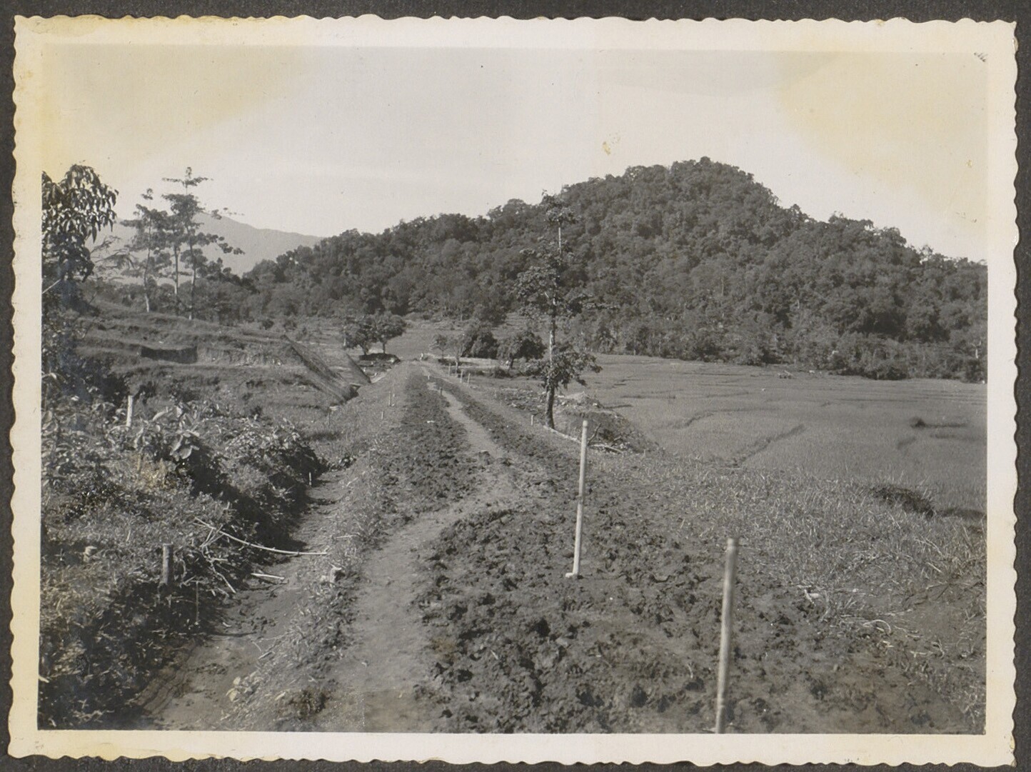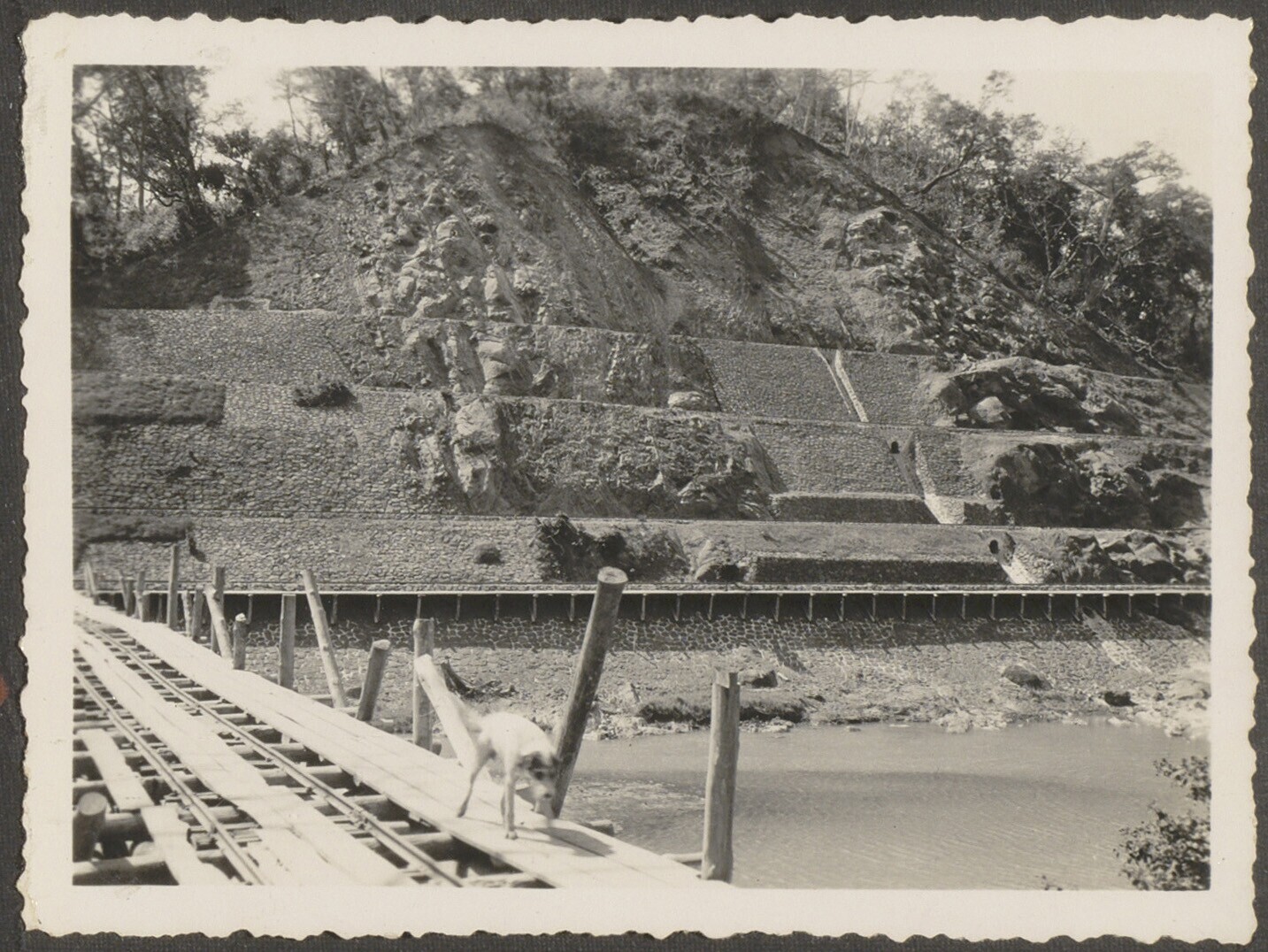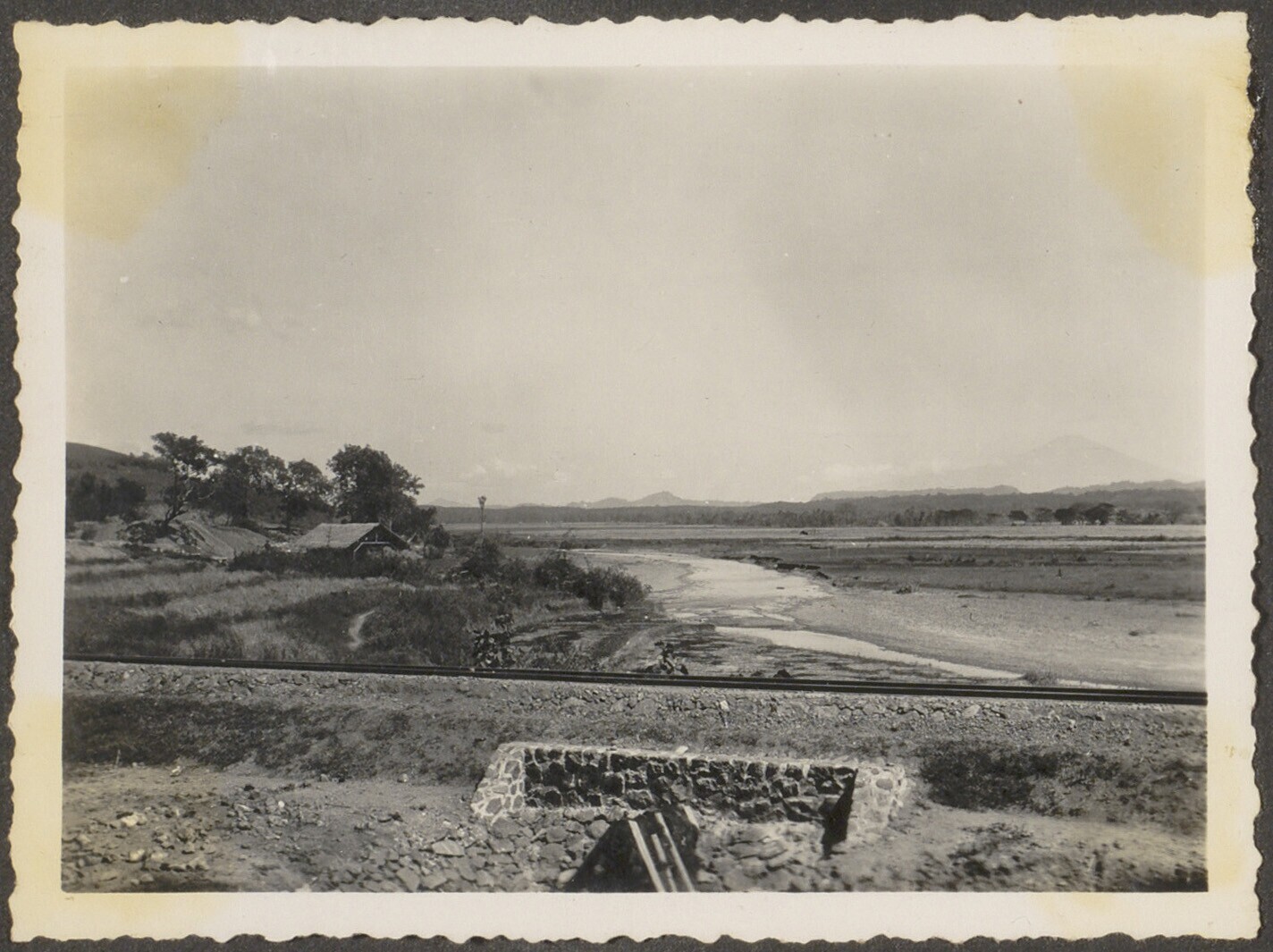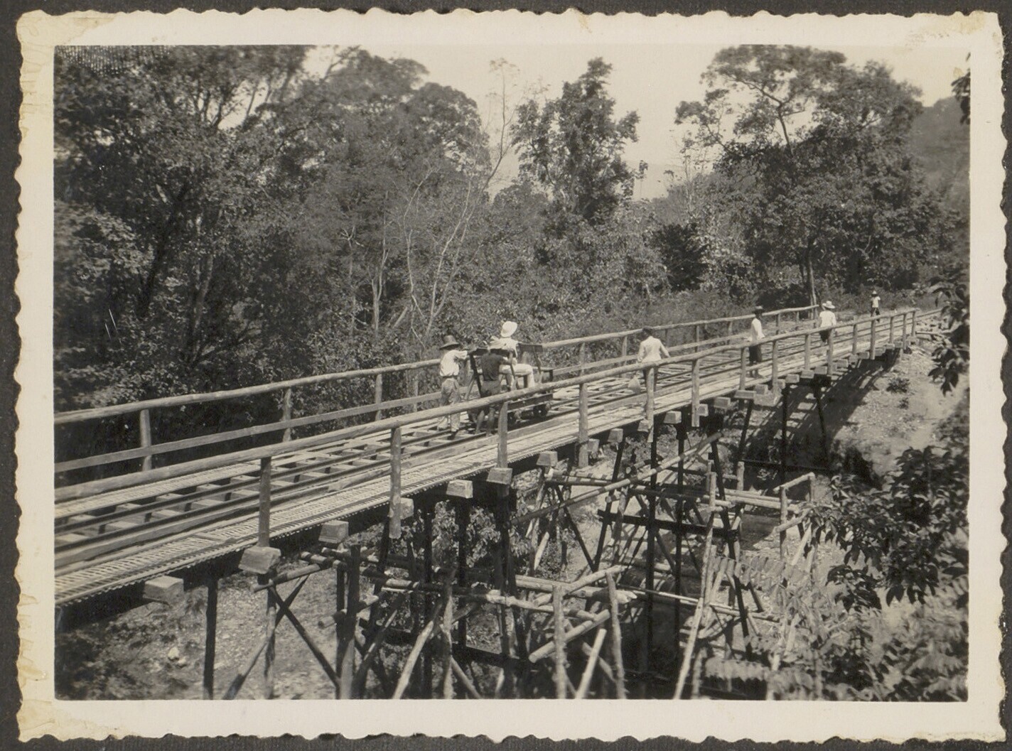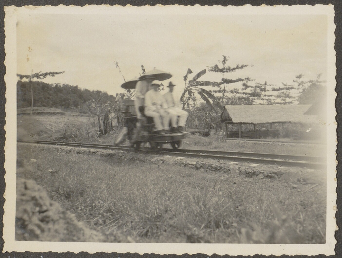 Vrouwen lopen langs een spoorweg bij de brug Malahajoe