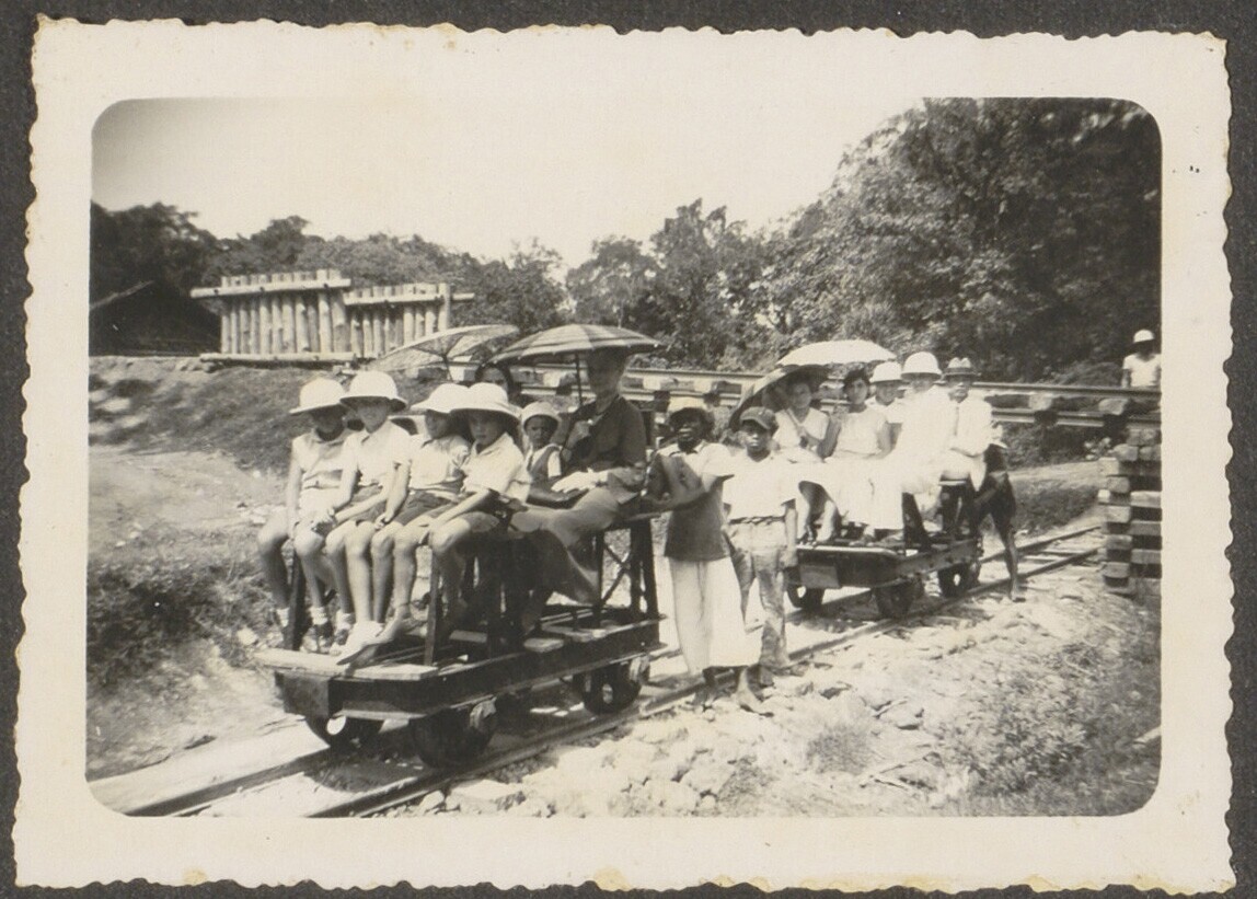 Kinderen, vrouwen en mannen in lorries op smalspoor
