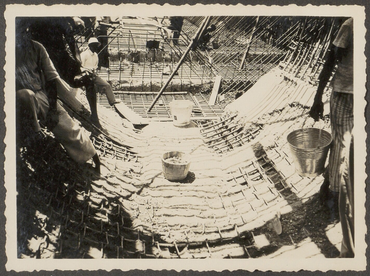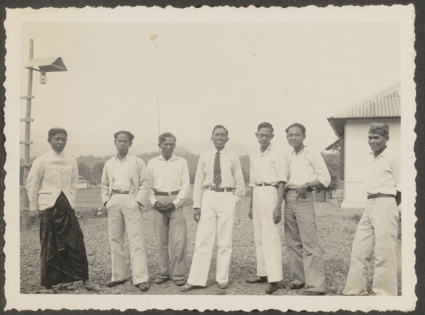 Javaanse arbeiders poseren voor een gebouw op uitbet...
