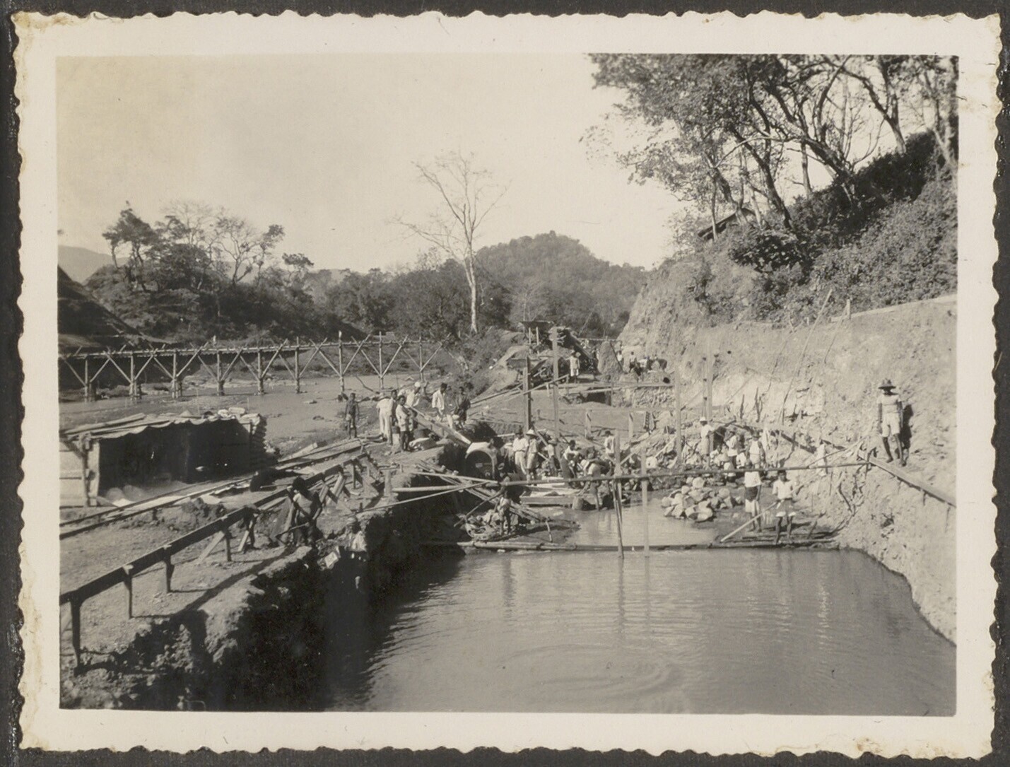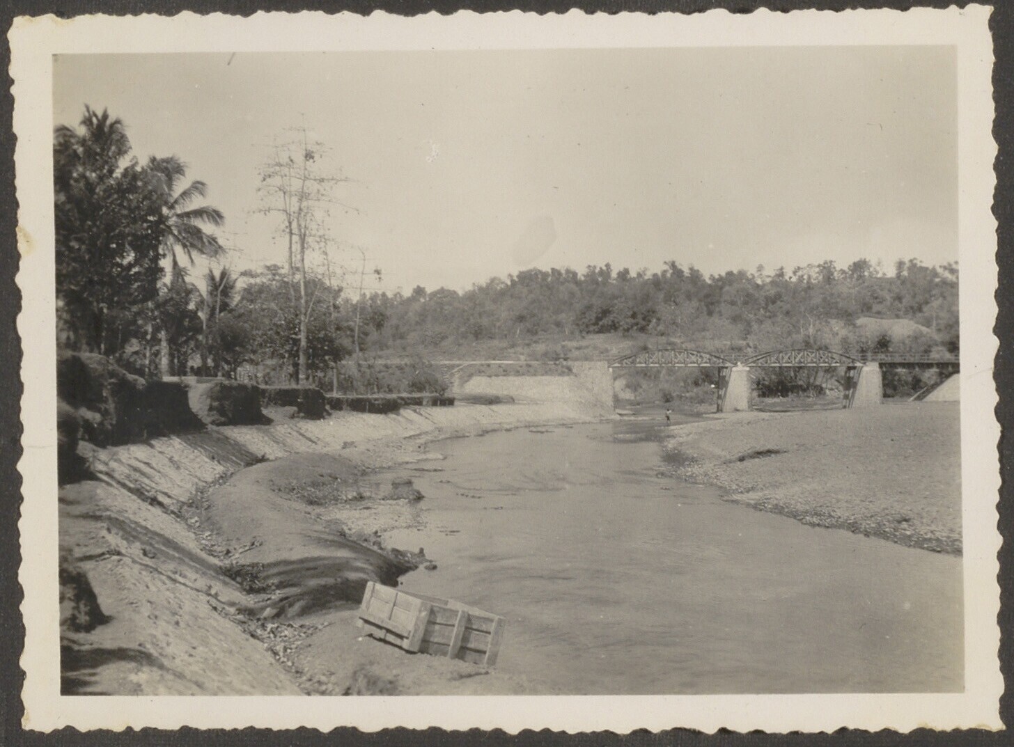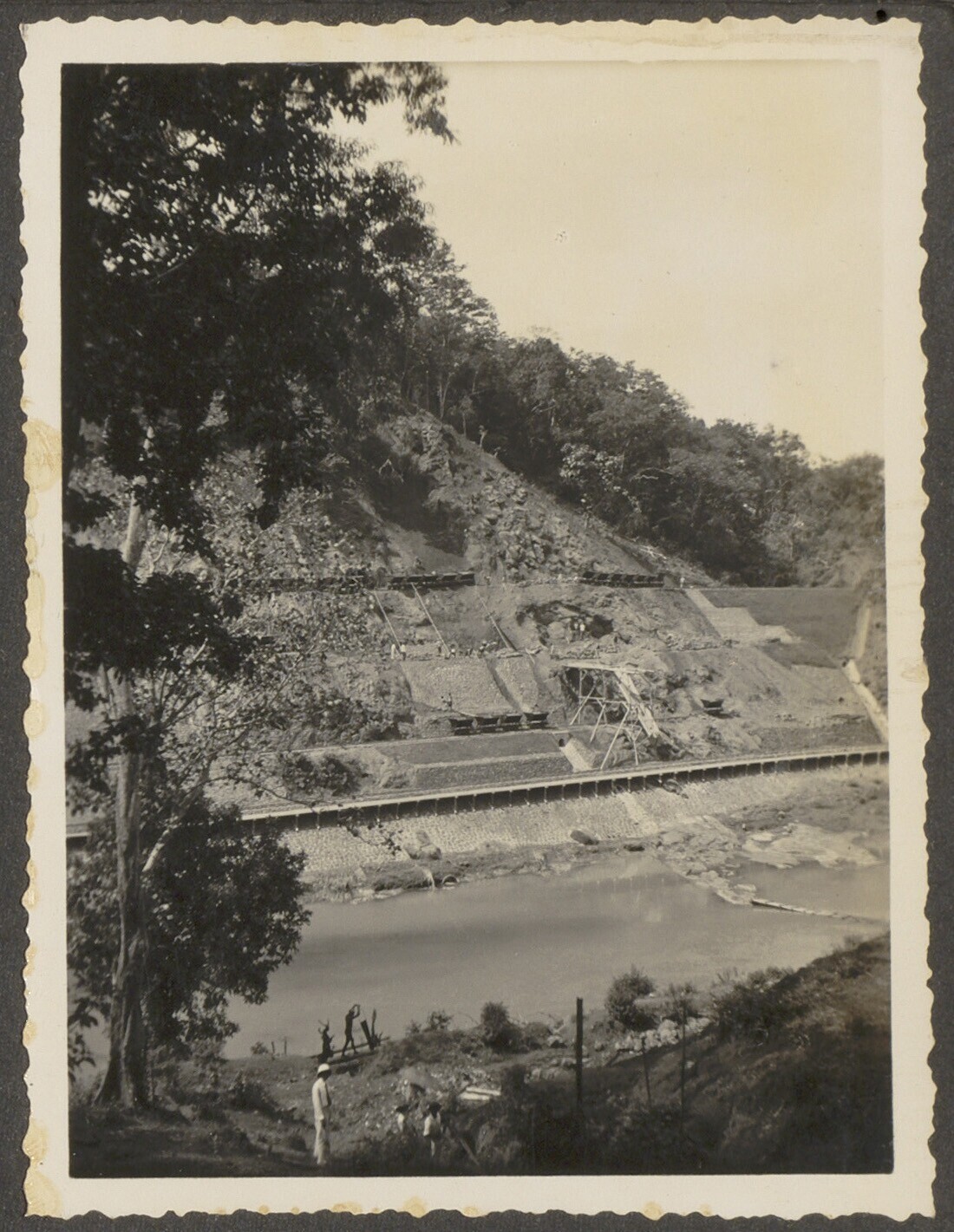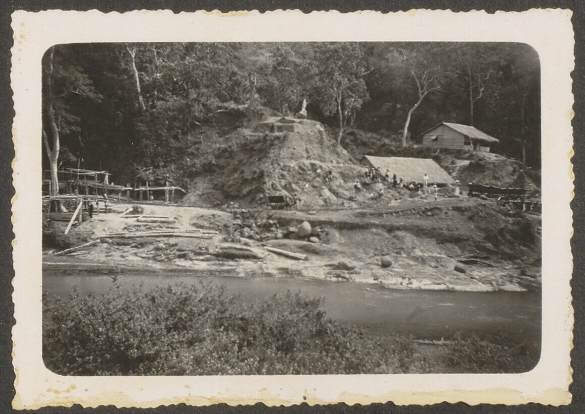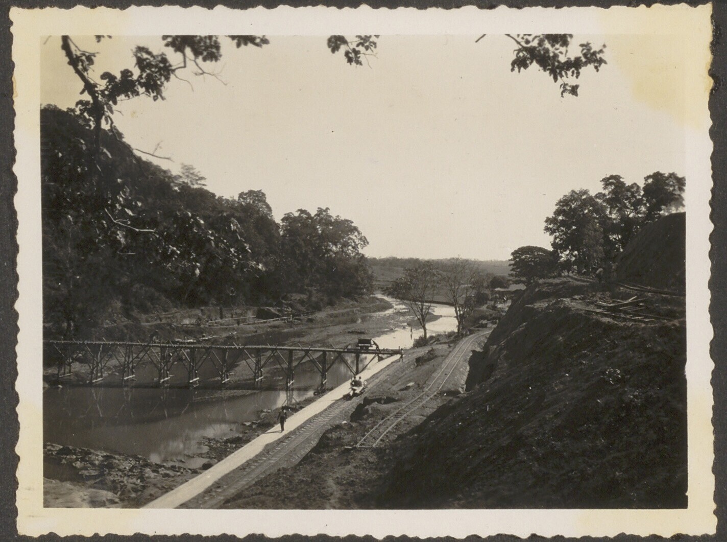 Aanleg van spoorbaan lang een rivier door Javaanse a...
