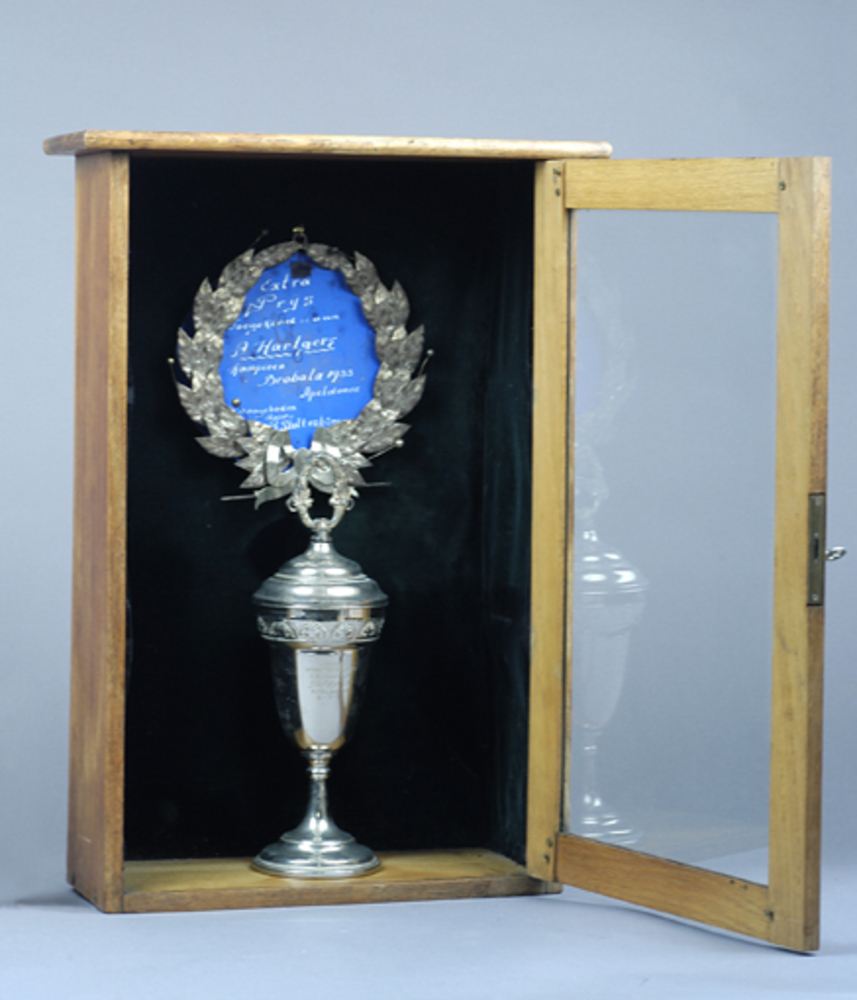 prijsbeker en lauwerkrans in vitrinekastje, gewonnen...
