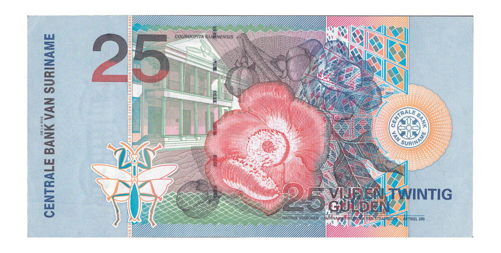 Bankbiljet van vijfentwintig gulden van Suriname, mo...