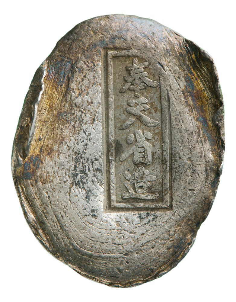 Sycee zilverbaar, ingestempeld met Chinese karakters