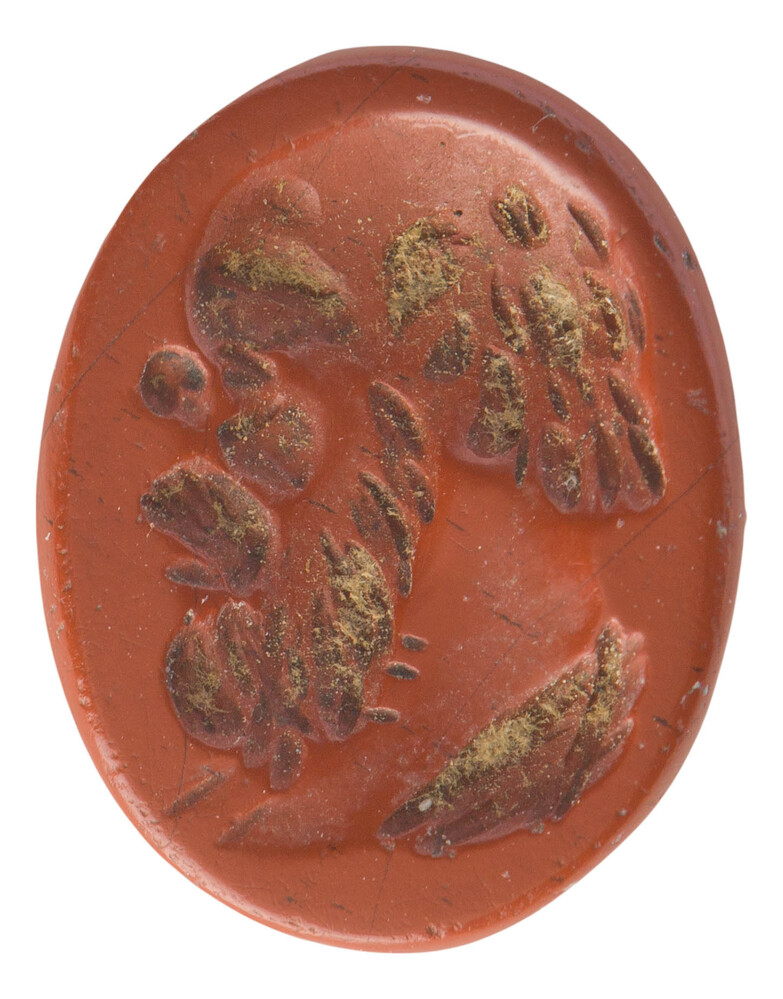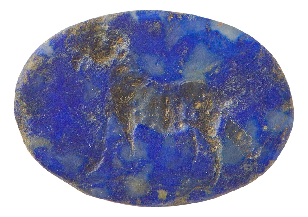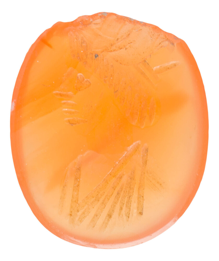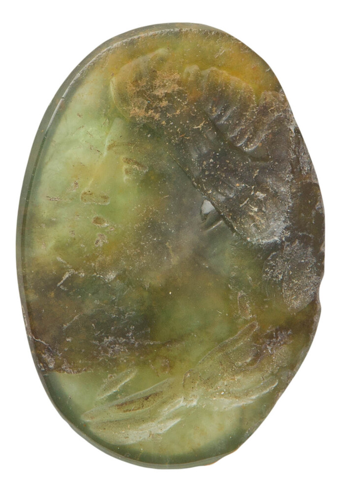 Gesneden steen met gehelmde zittende figuur naar links