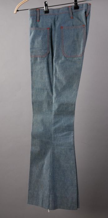 Spijkerbroek met wijduitlopende pijpen met rode stik...
