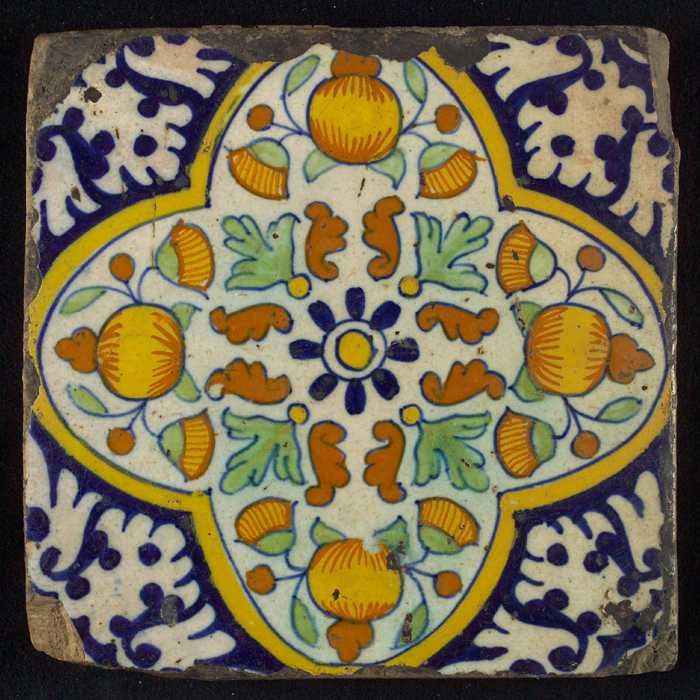 Ornamenttegel, rozet waarboven oranjeappels en gouds...