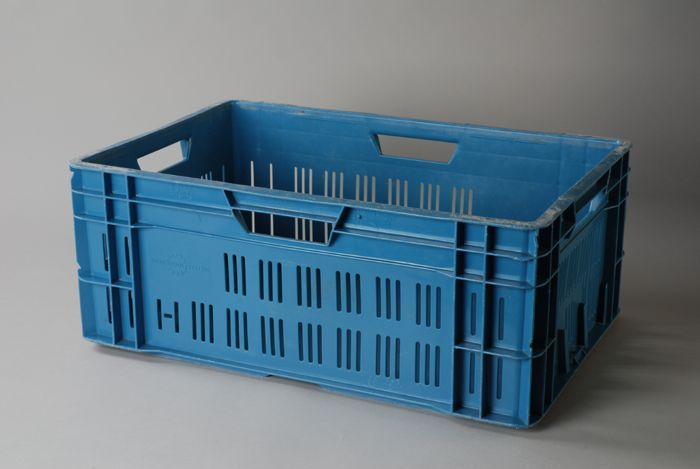 Blauwe krat gebruikt voor verzamelen voedselpakket