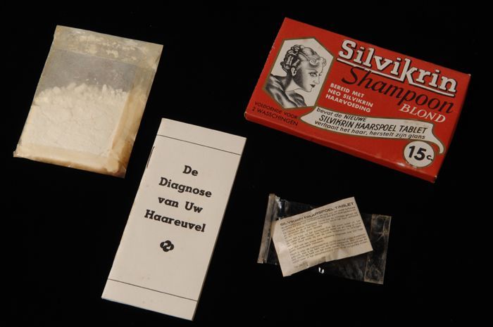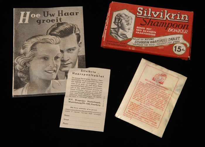 Kartonnen doosje (A) met zakje Silvikrin shampoo (B)...