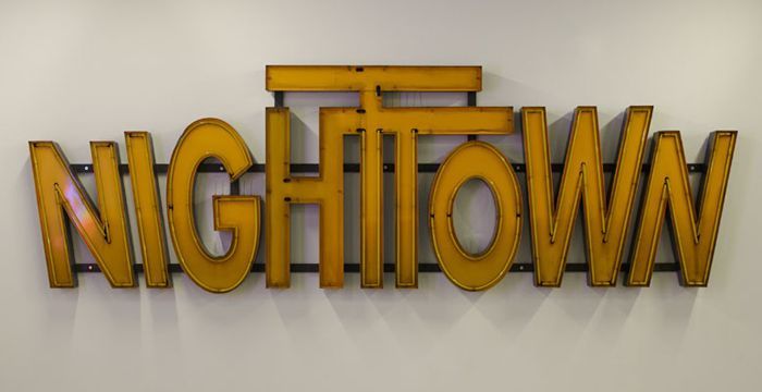 Gele neon letters van poppodium "NIGHTTOWN"