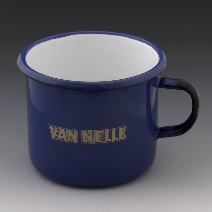 Emaillen beker van Van Nelle, witte binnenkant, blau...