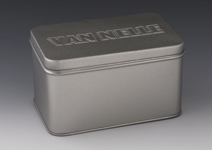 Blik (A) met deksel (B) van Van Nelle, letters in re...