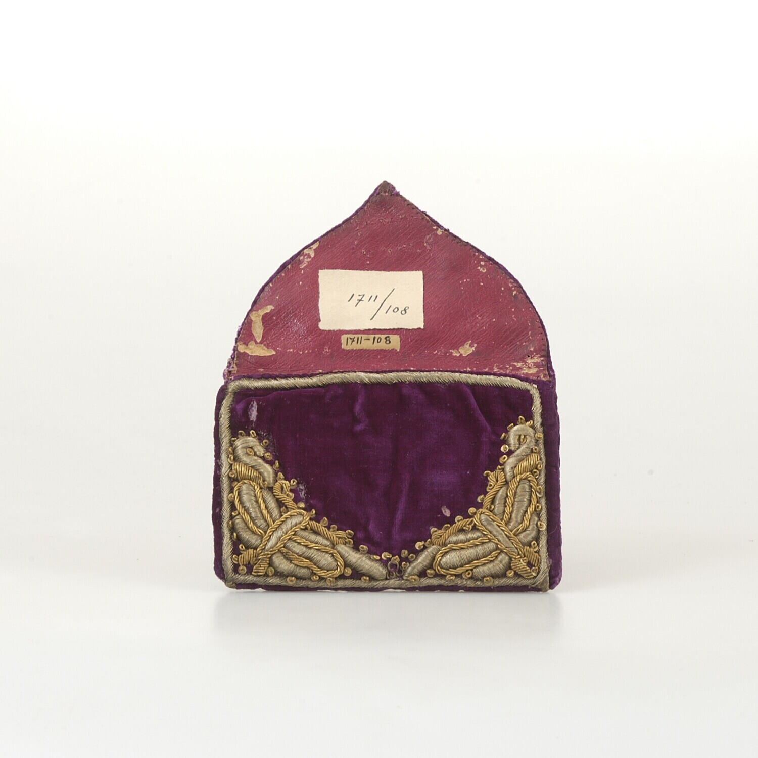 Borduurwerk op paars fluweel, bestemd voor sloffen