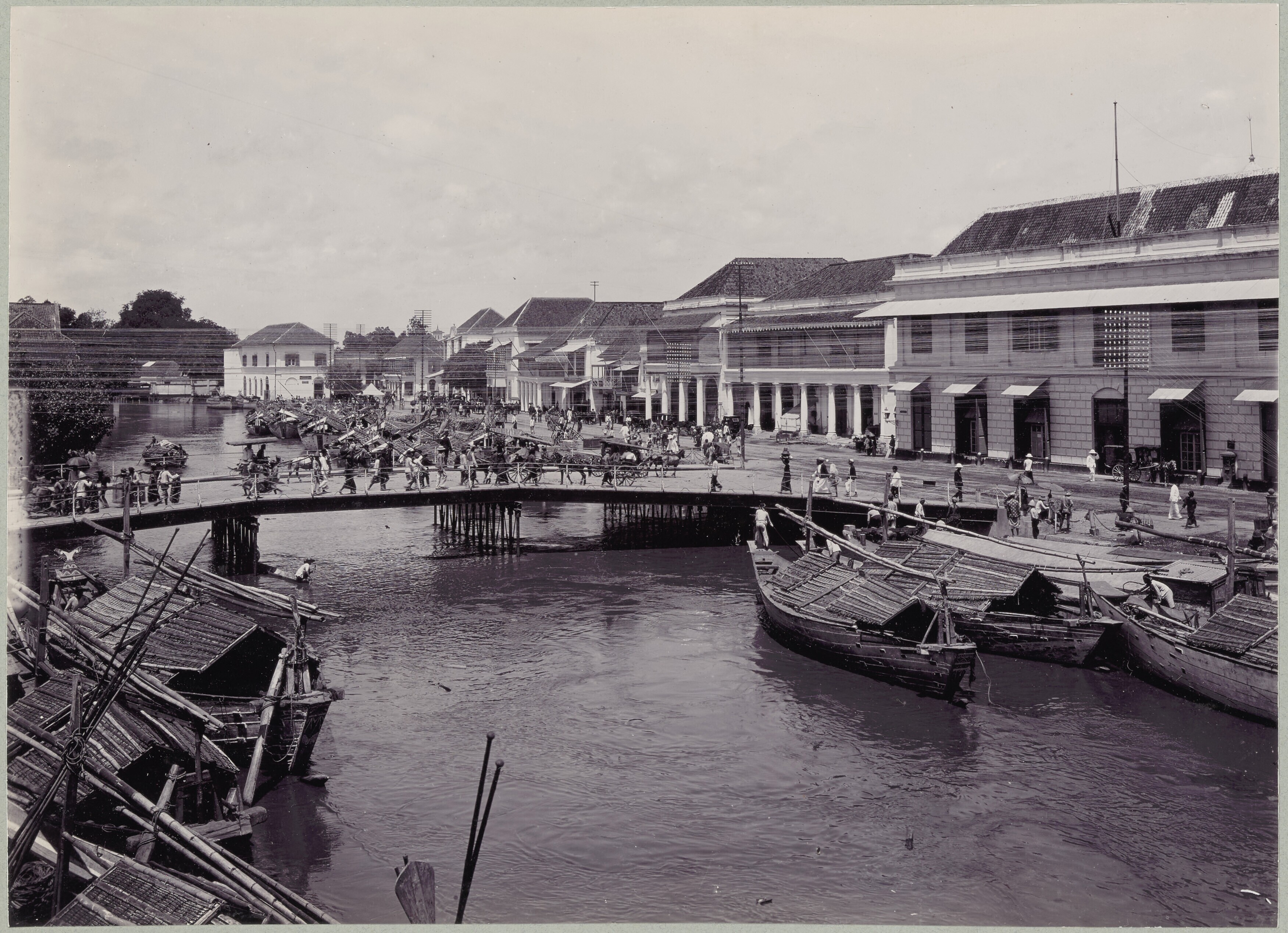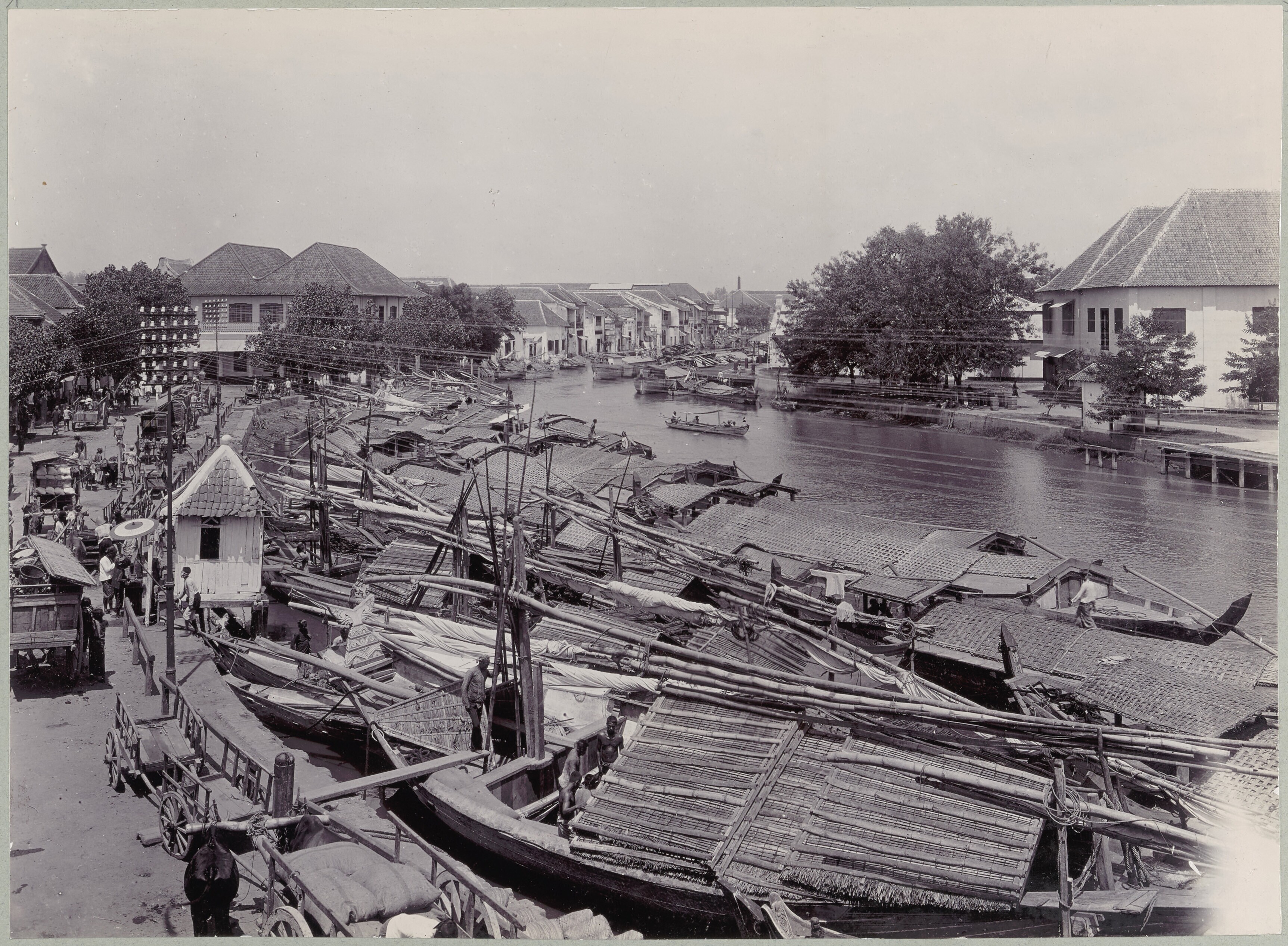 Gezicht op de rivierkade met ossenkarren en afgemeer...