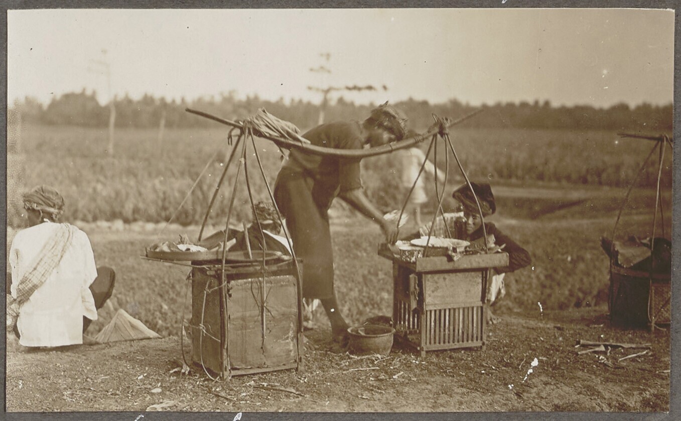 Groep Europese en Javaanse personen bij de bezemwage...