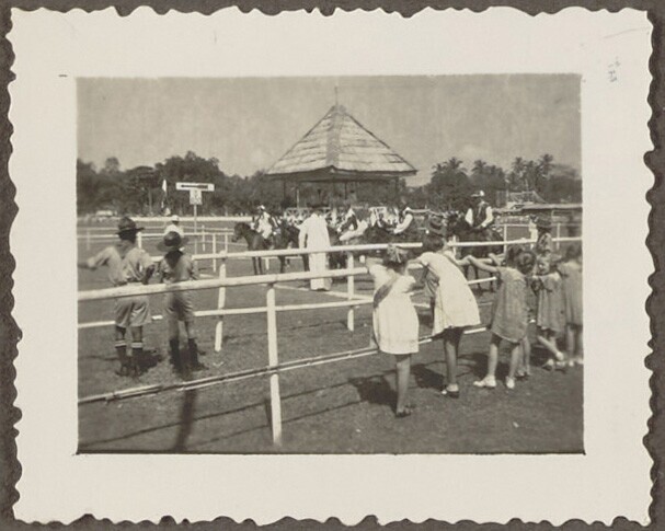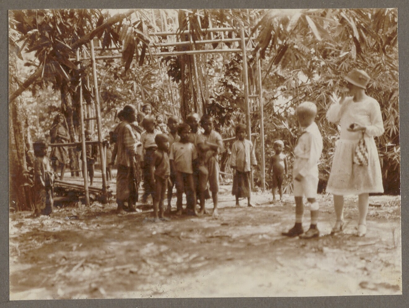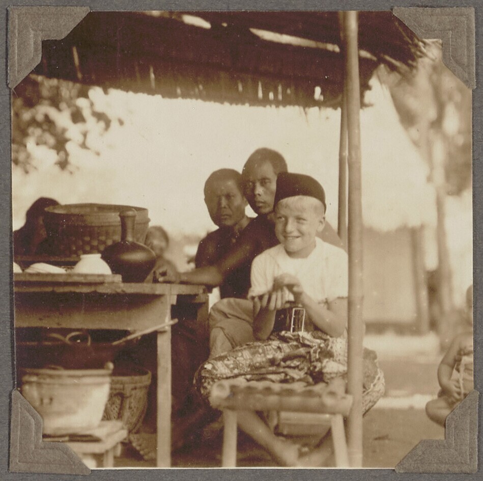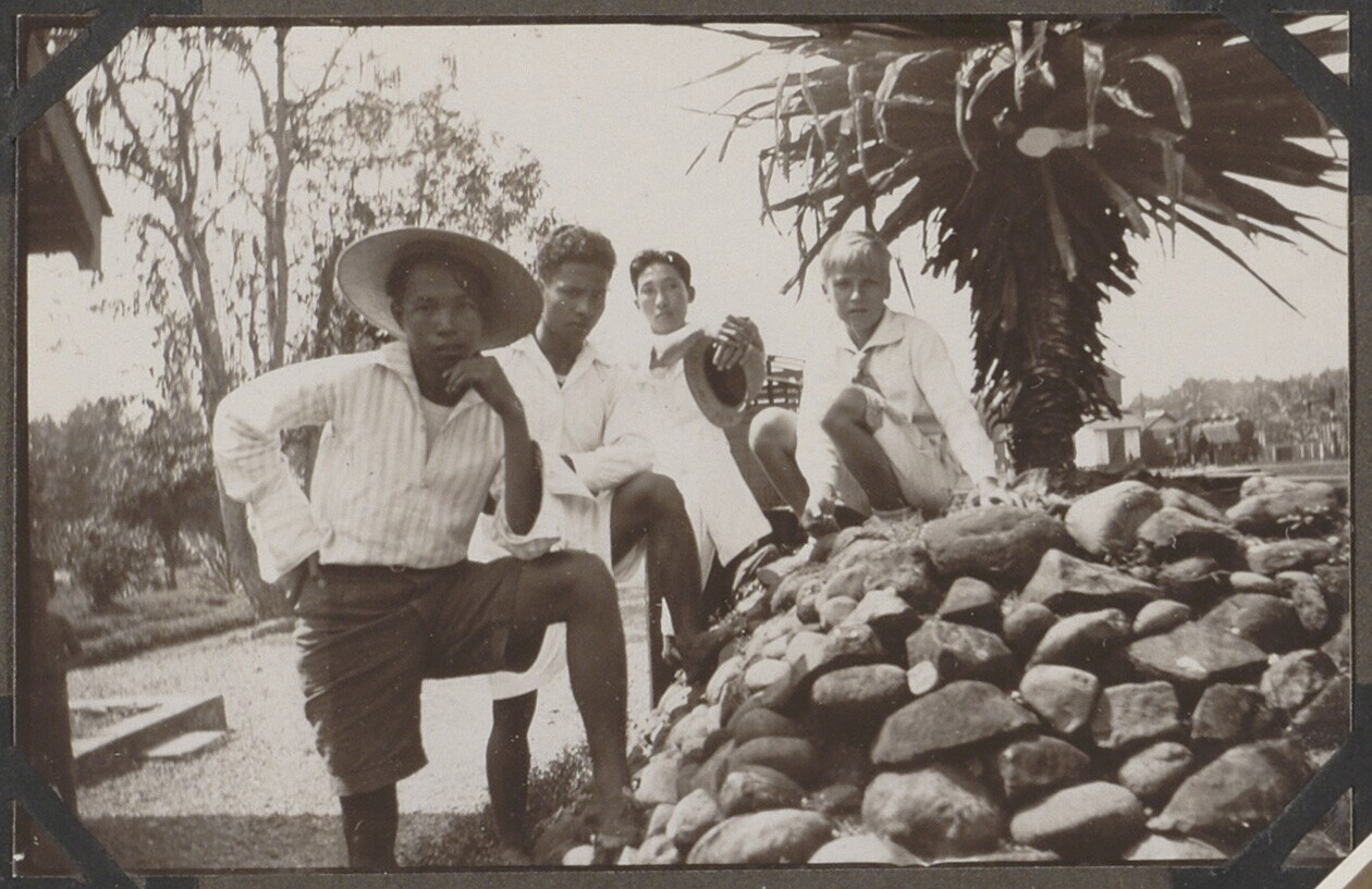 Europese en Javaanse jongens bij een stenen muurtje