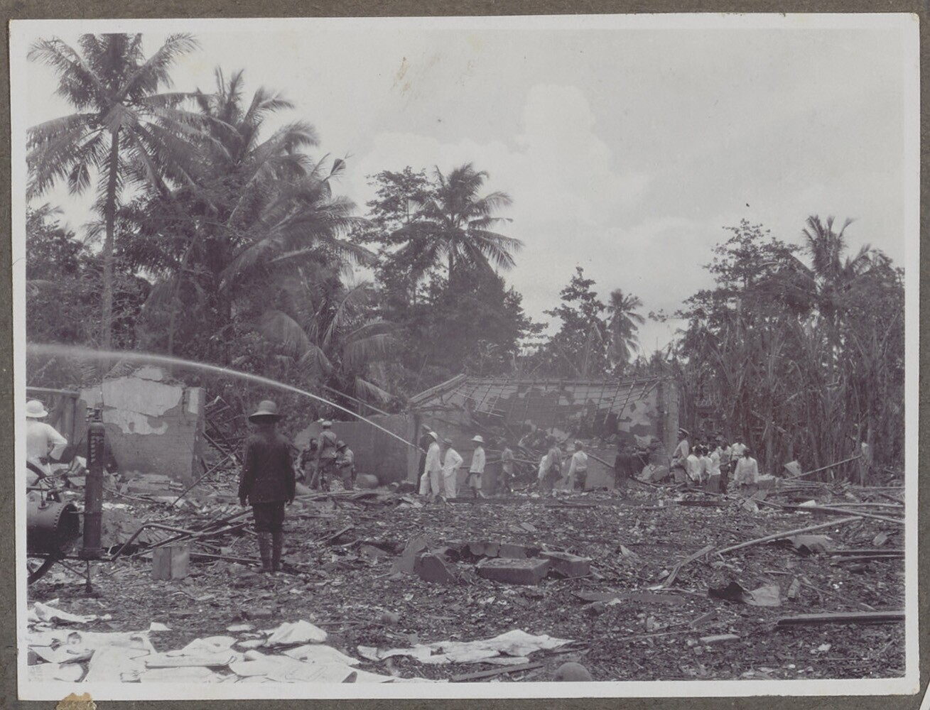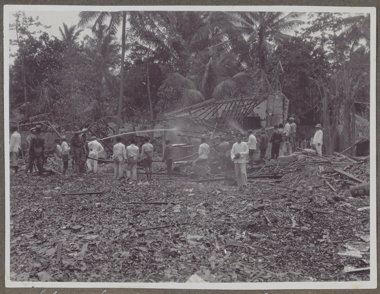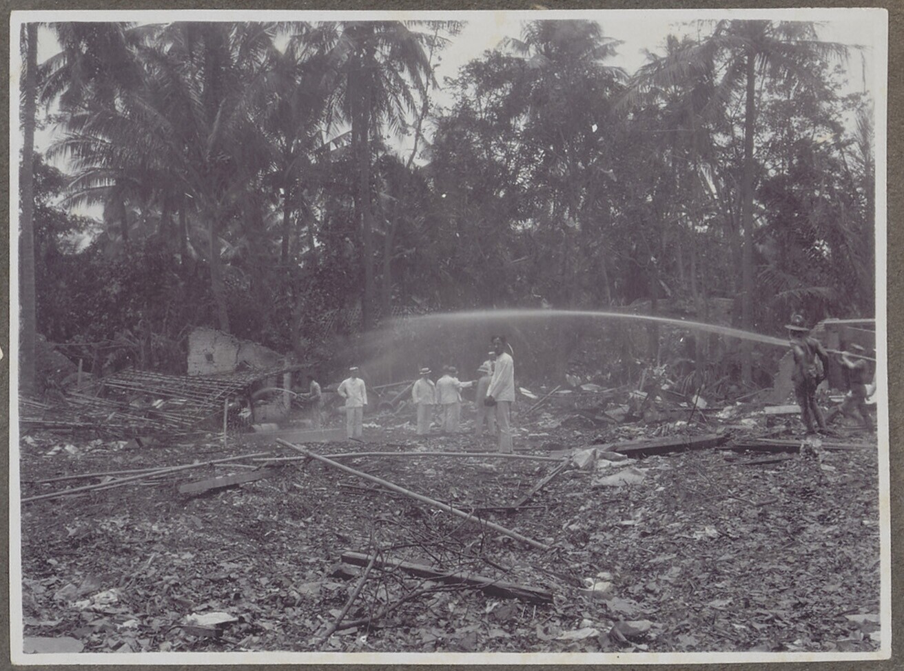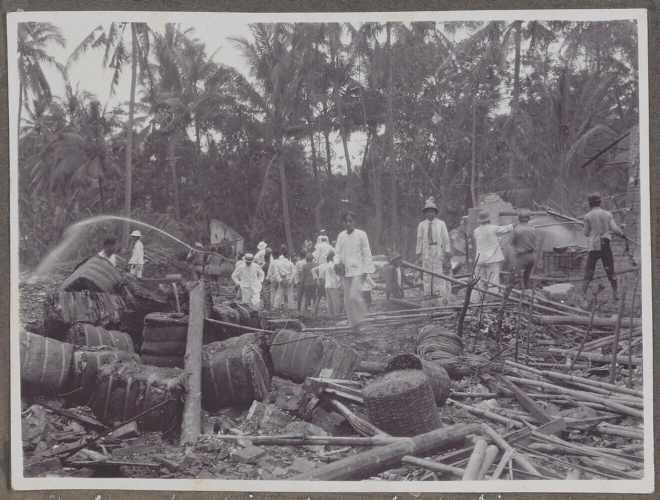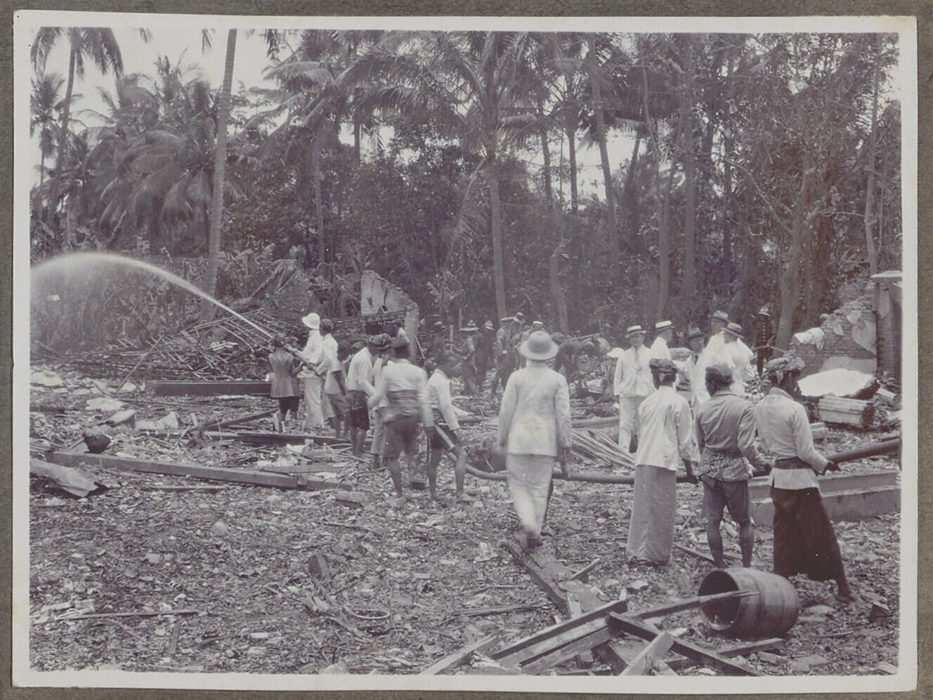 Groep Europese en Javaanse mannen bij het nablussen ...