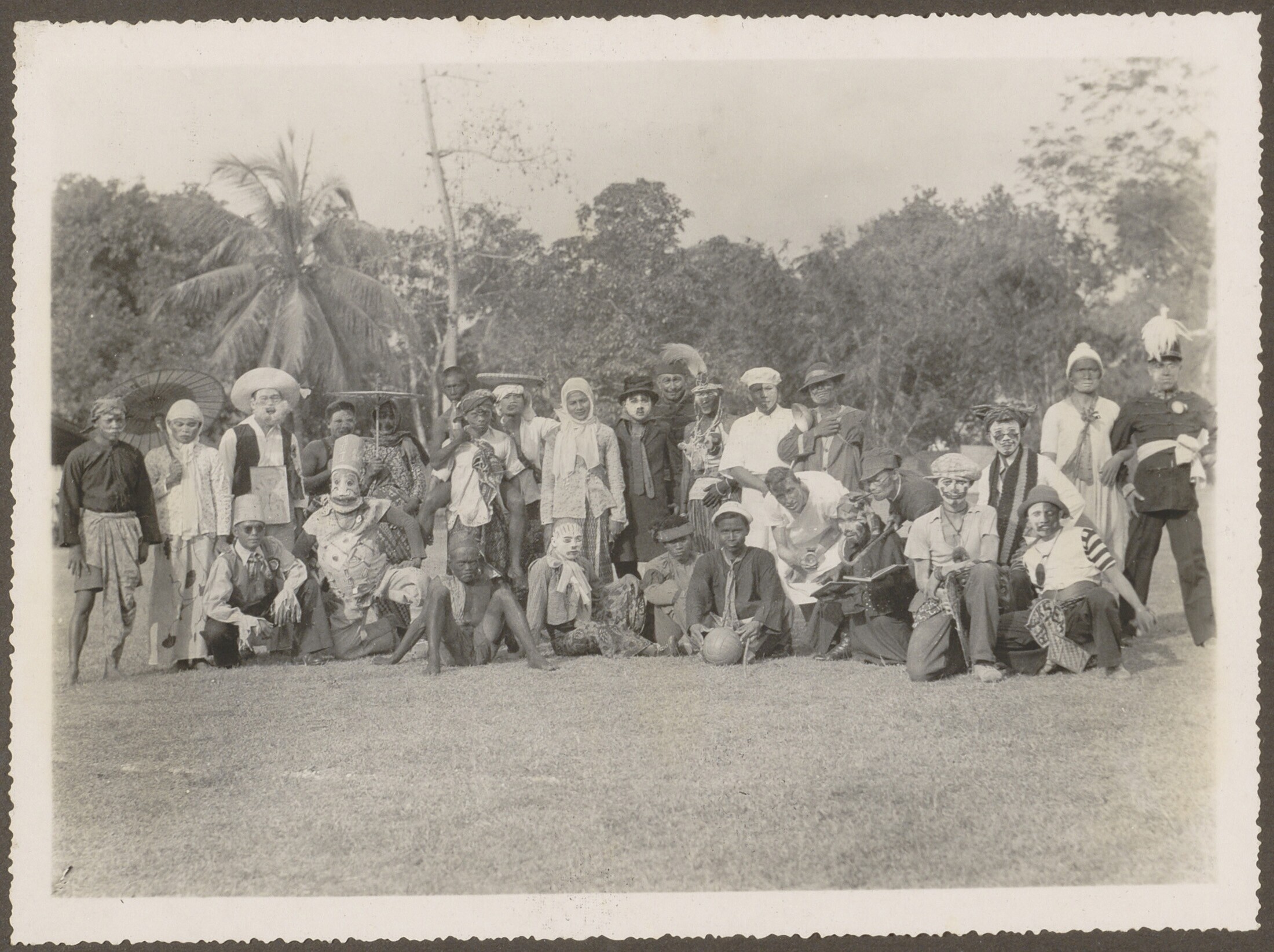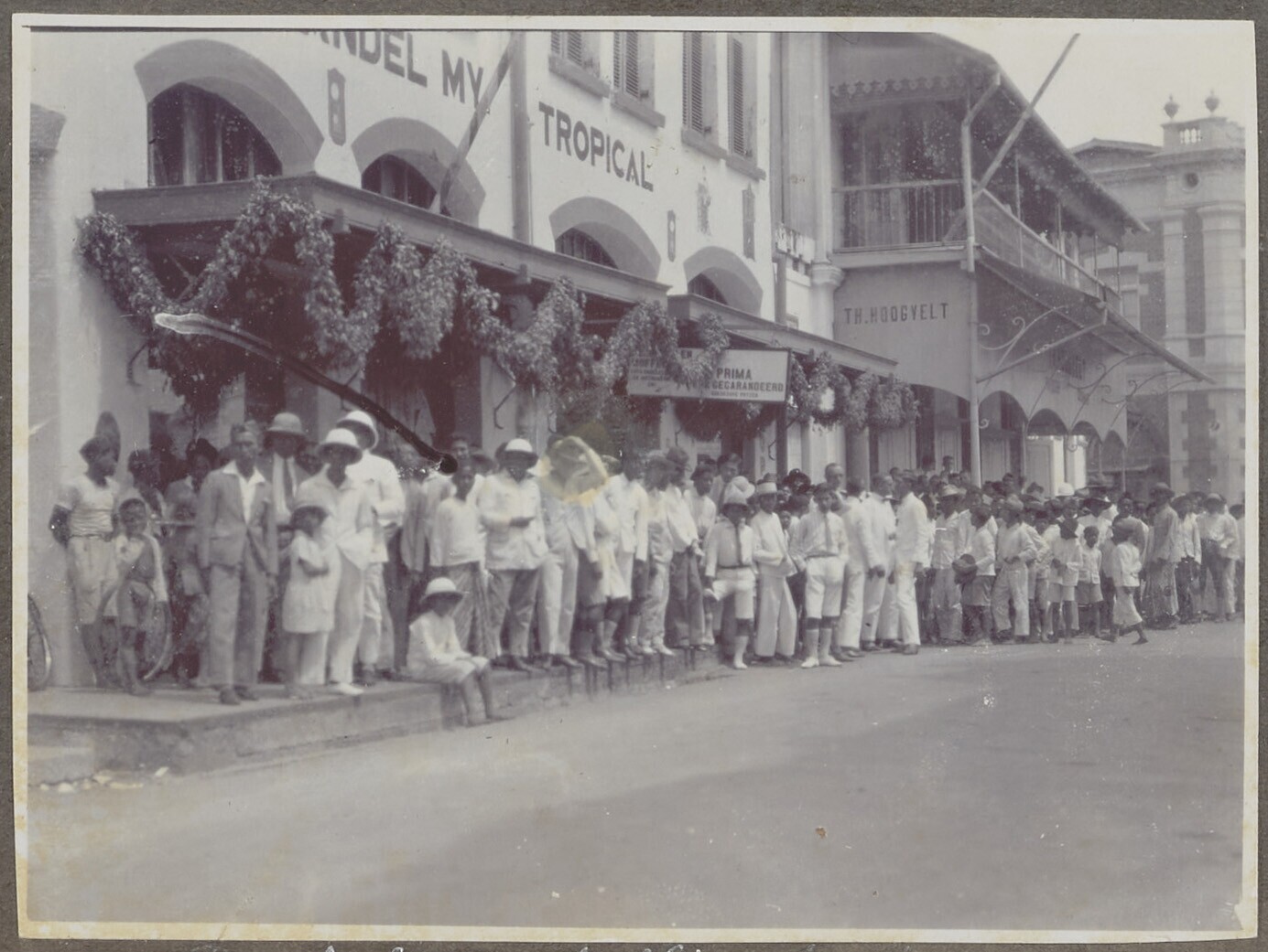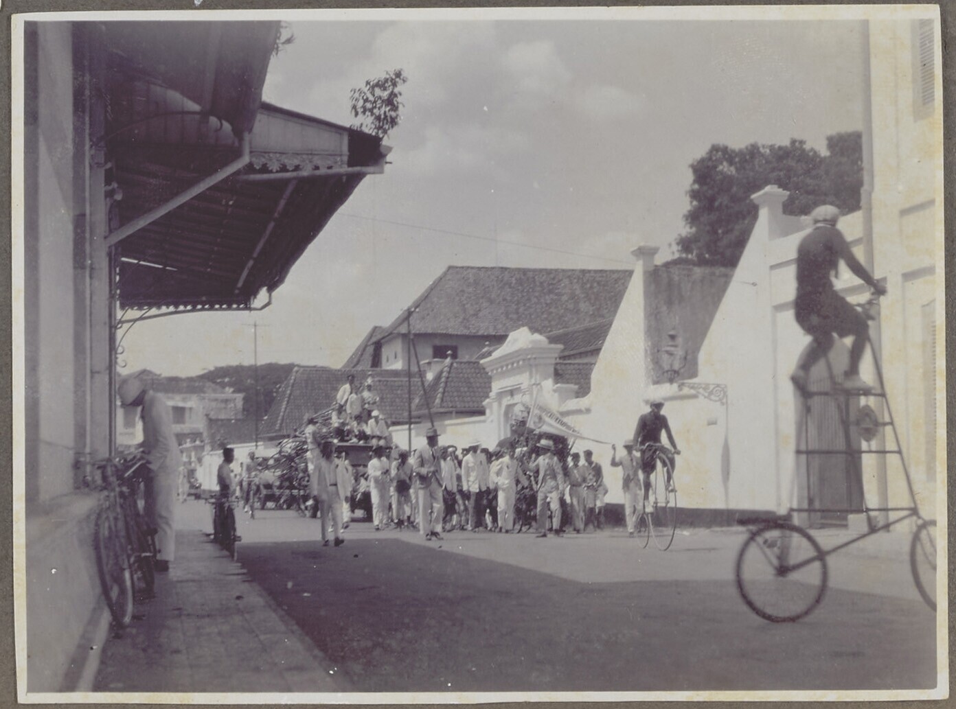 Een groep Europese en javaanse mannen op straat bij ...