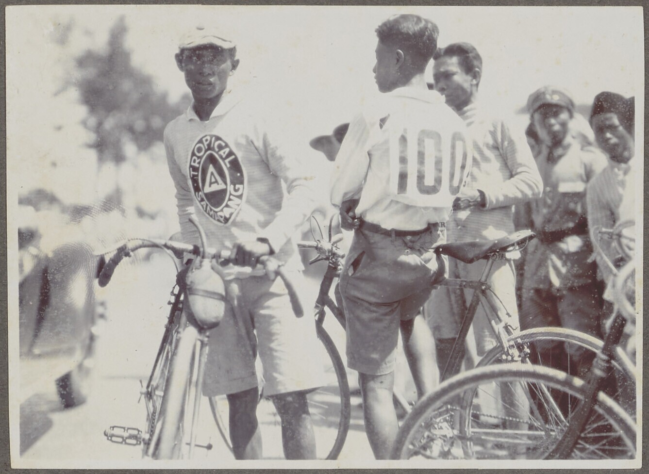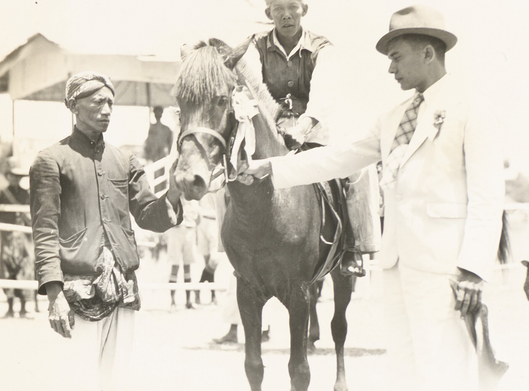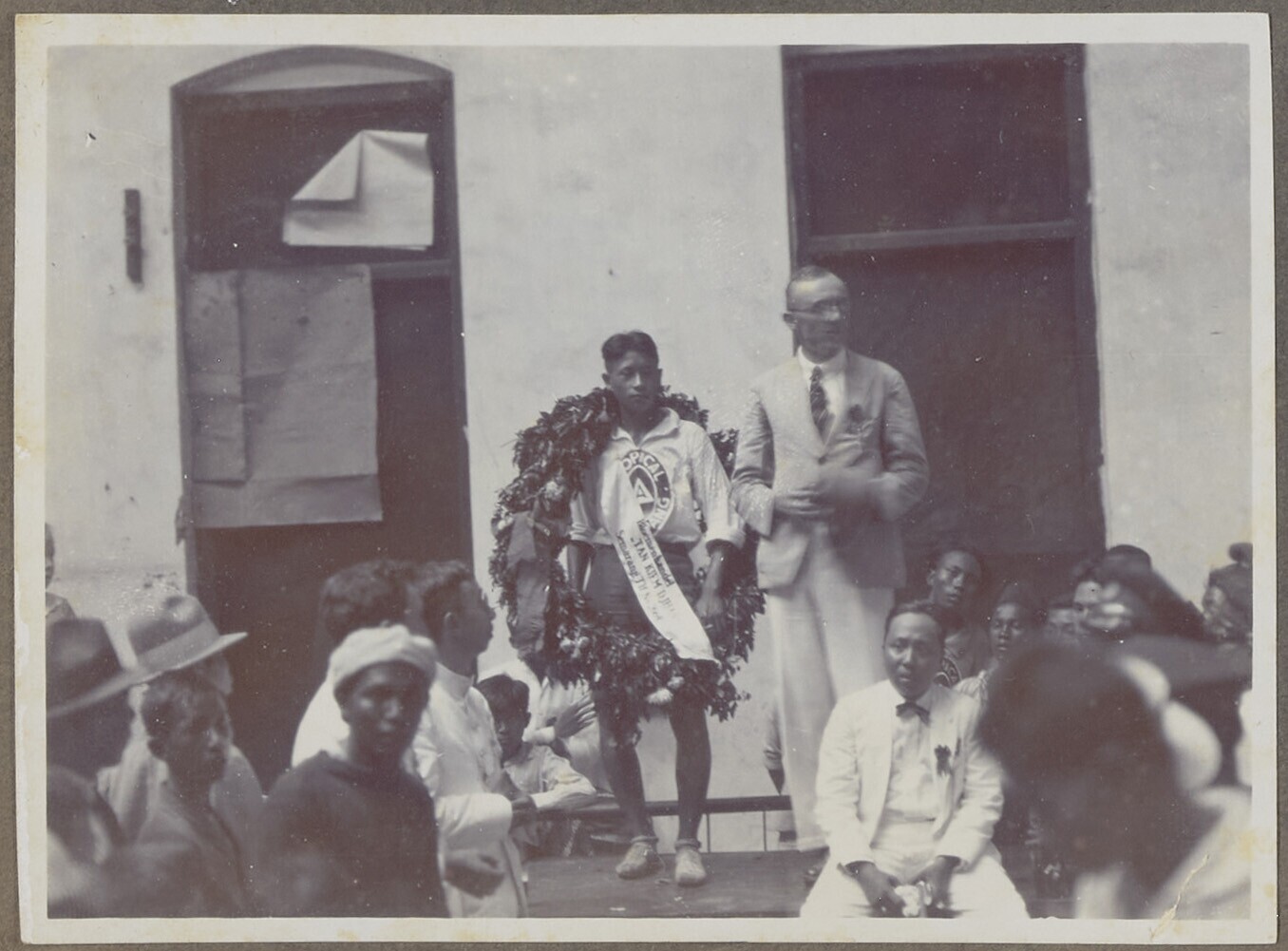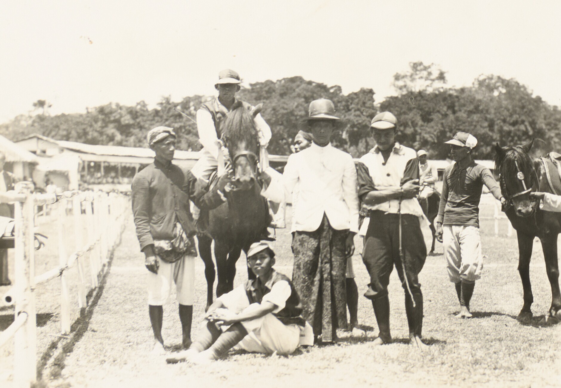 Een groep Europese en javaanse mannen op straat bij ...