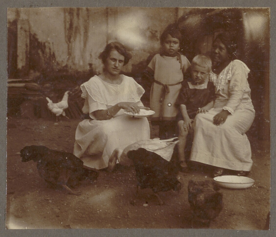 Europese en Javaanse vrouw en kinderen zitten bij ee...